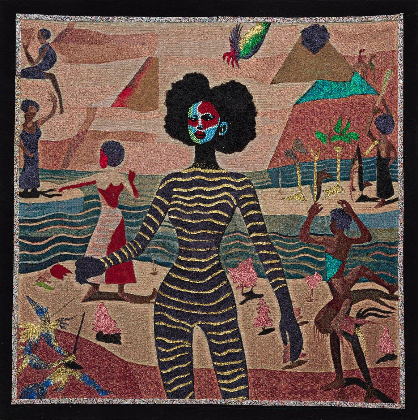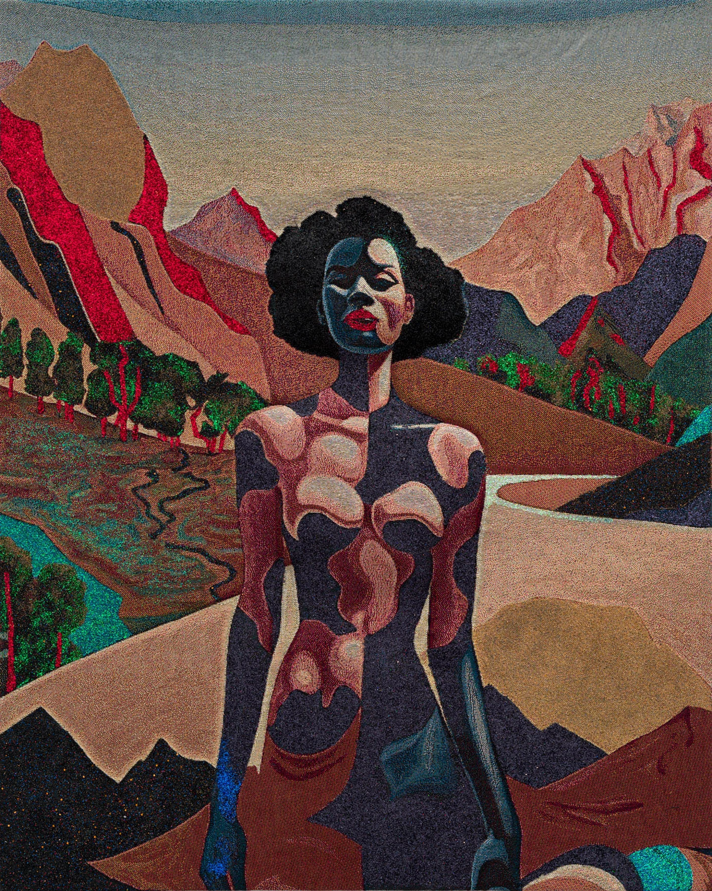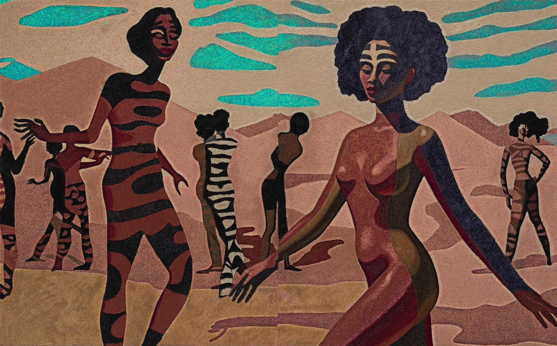 Lithe women covered in animal stripes and abstract forms, or else donning gowns and jewels, dancing through sepia landscapes, sand dunes surrounded by pyramids, verdant valleys and beachfronts. Akea Brionne’s vivid tapestries are often inspired by her own dreams, but for all of their surreal elements, Brionne insists they’re rooted in reality, reflecting humanity’s complicated relationship with the world around us.