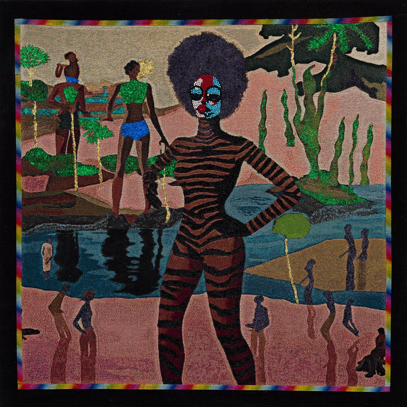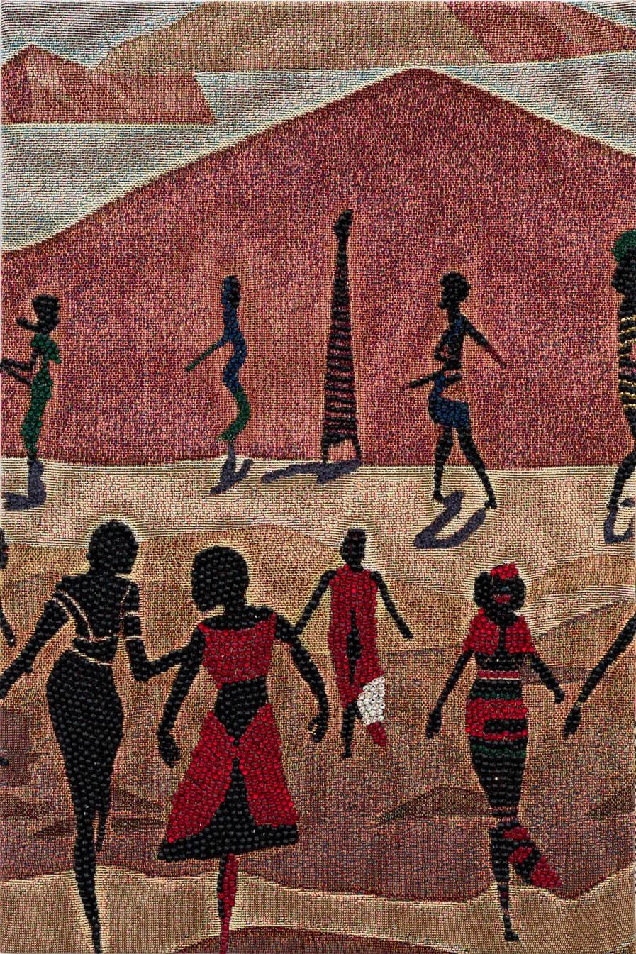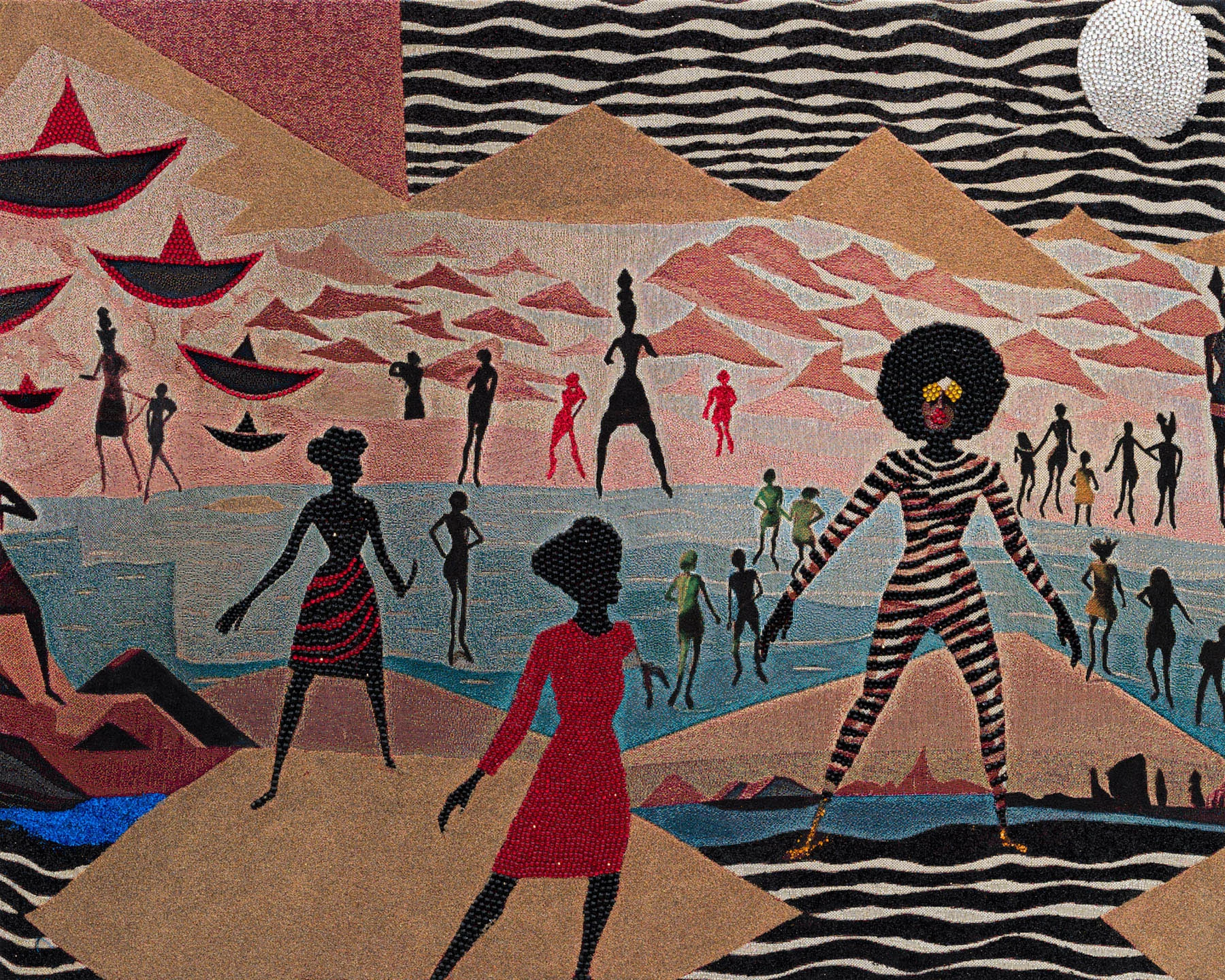 Lithe women covered in animal stripes and abstract forms, or else donning gowns and jewels, dancing through sepia landscapes, sand dunes surrounded by pyramids, verdant valleys and beachfronts. Akea Brionne’s vivid tapestries are often inspired by her own dreams, but for all of their surreal elements, Brionne insists they’re rooted in reality, reflecting humanity’s complicated relationship with the world around us.
