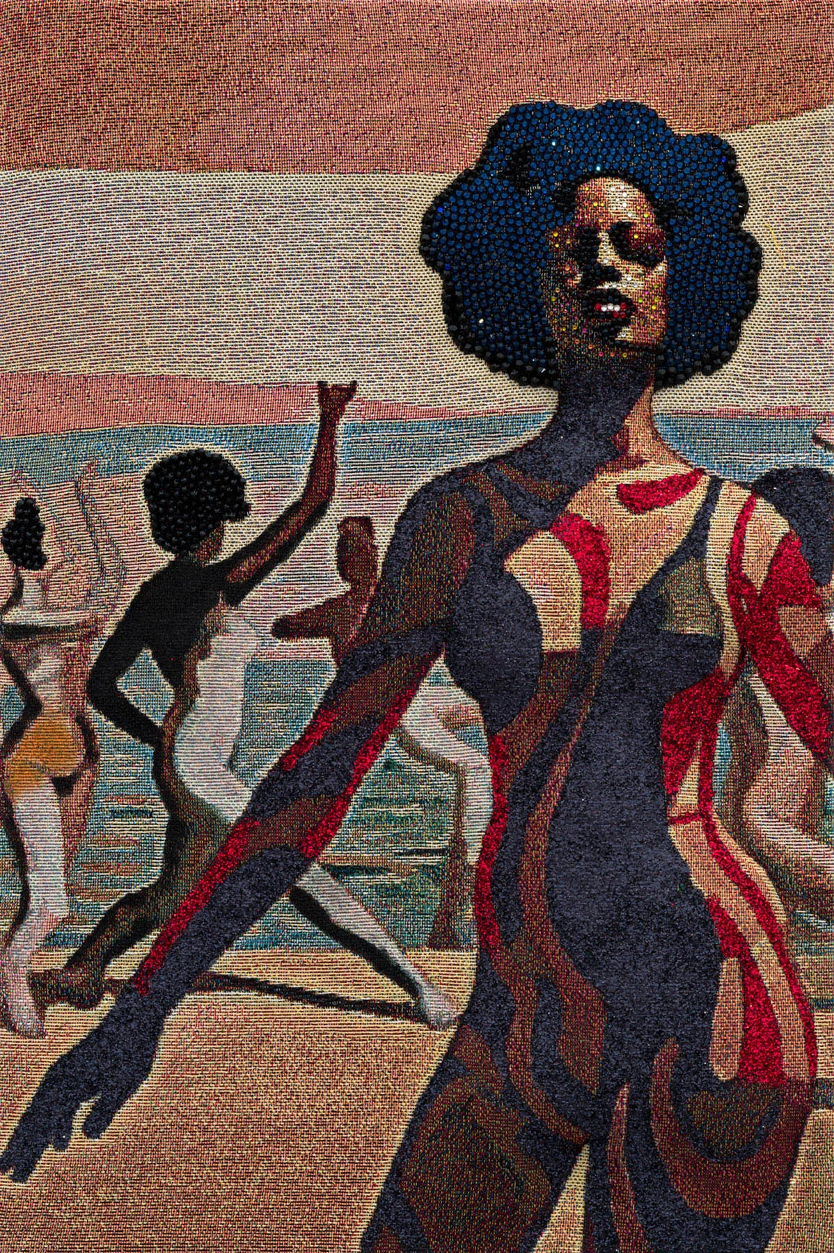 Brionne stresses, however, that her work is as lens and research-based as ever, though the process has changed considerably. To create a tapestry, she first layers self-portraits, family photos and appropriated imagery. Then, she feeds the collage into a private generative AI model she’s trained on her own work “so they look less like photographs and more like drawings or paintings.” After further tweaks in Adobe Photoshop and Lightroom, she sends the image off to be printed with a digital loom. She adds the embellishments herself.