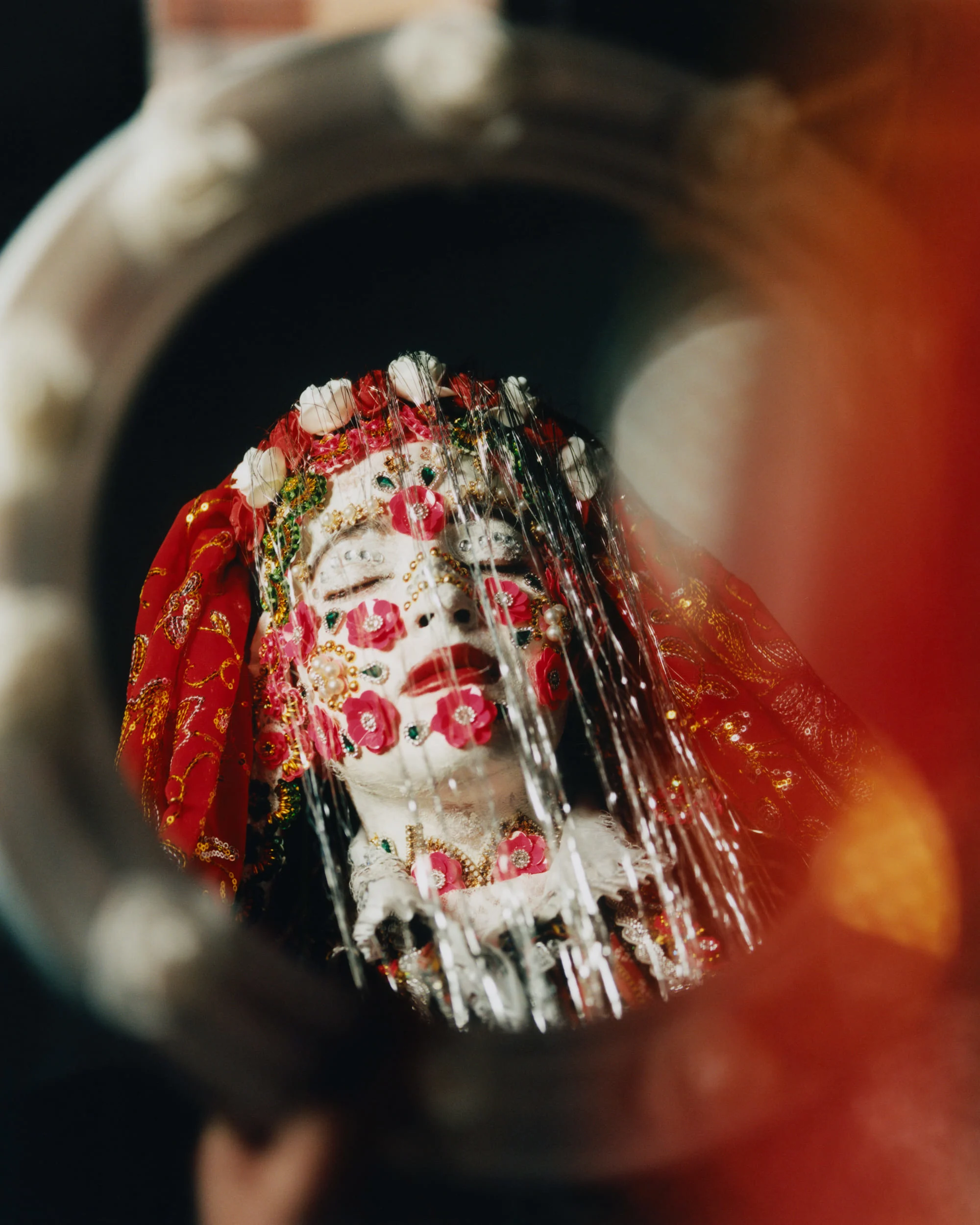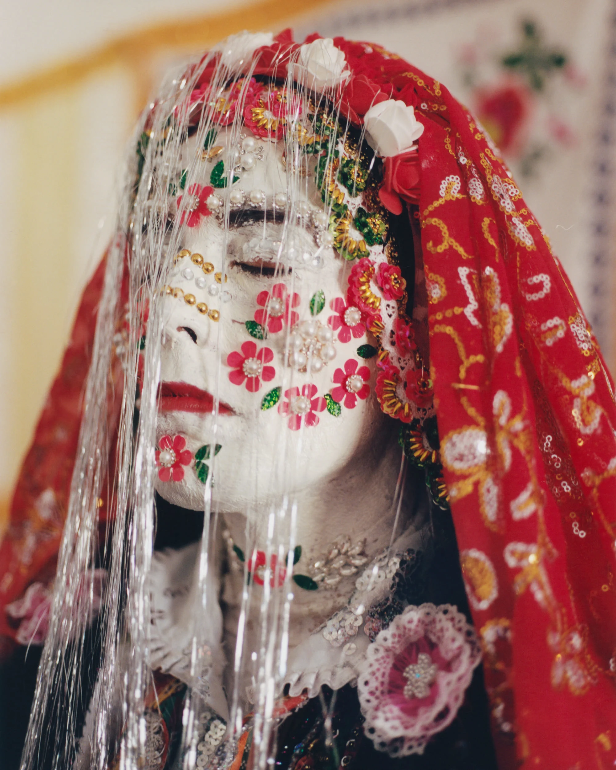 When the bride is finally ready to go, she holds a mirror in front of her hands, keeping her eyes closed in order to ward off the evil eye. She then walks to her husband’s home, while the whole village watches on, and only reopens her eyes in her new marital home, the process marking her transition into married life. The groom then removes the sequins one by one in privacy in a sweet ritual set to test his patience, while marking their new commitment to each other.