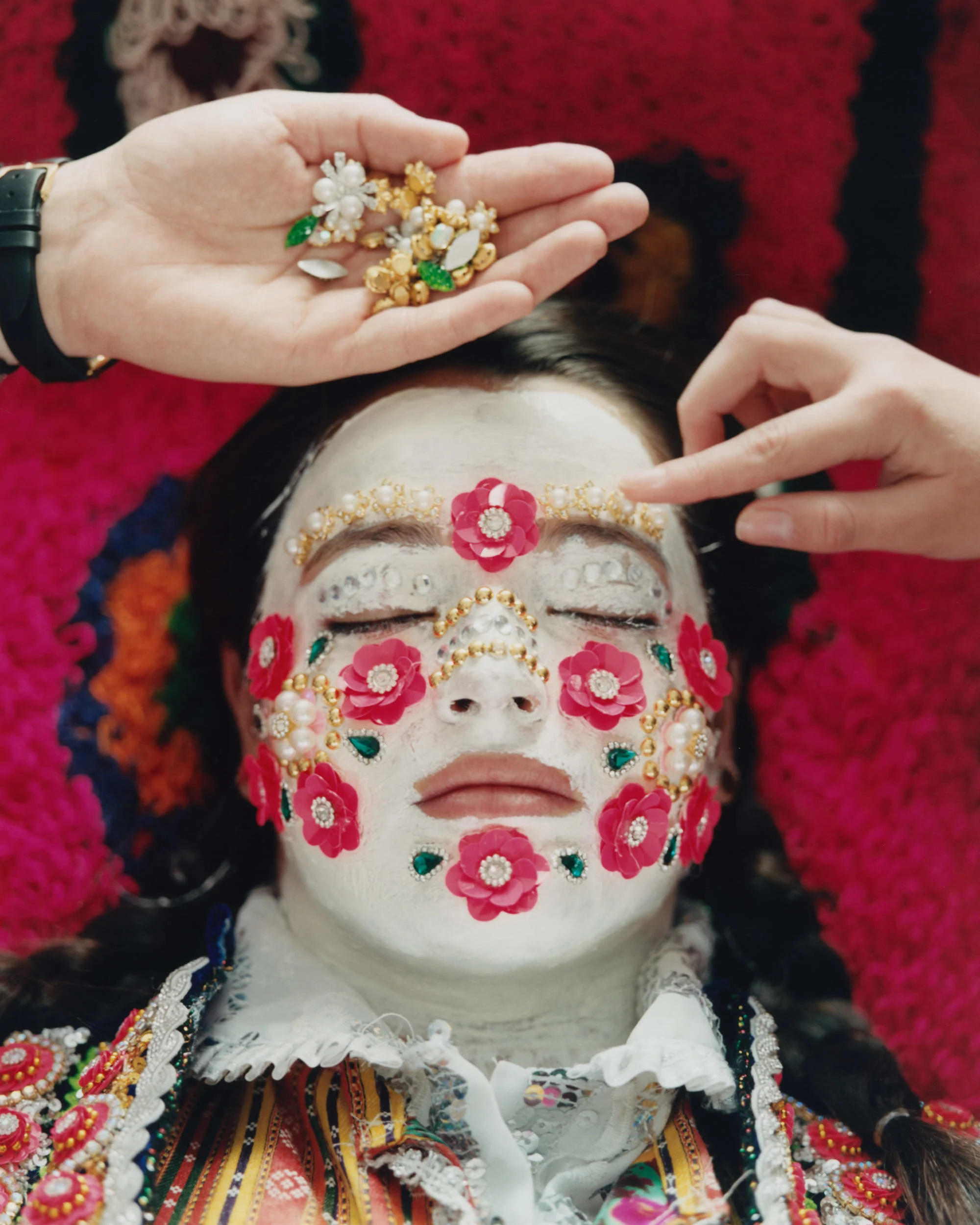 Perhaps the most potent tradition of the Pomak wedding is the Gelina ceremony, in which the bride lies in her family home for up to four hours while elaborate makeup is applied to symbolize purity and piety. The intricate process, once made from natural ingredients, has gradually incorporated modern cosmetics, decorative flowers, sequins and jewels. “It’s an emotional time,” says Kurunis, who was granted rare access to this sacred ritual. “It’s described as the moment where the bride dies as a maiden and is reborn as a woman. There are a lot of tears as she says goodbye to her old life.”