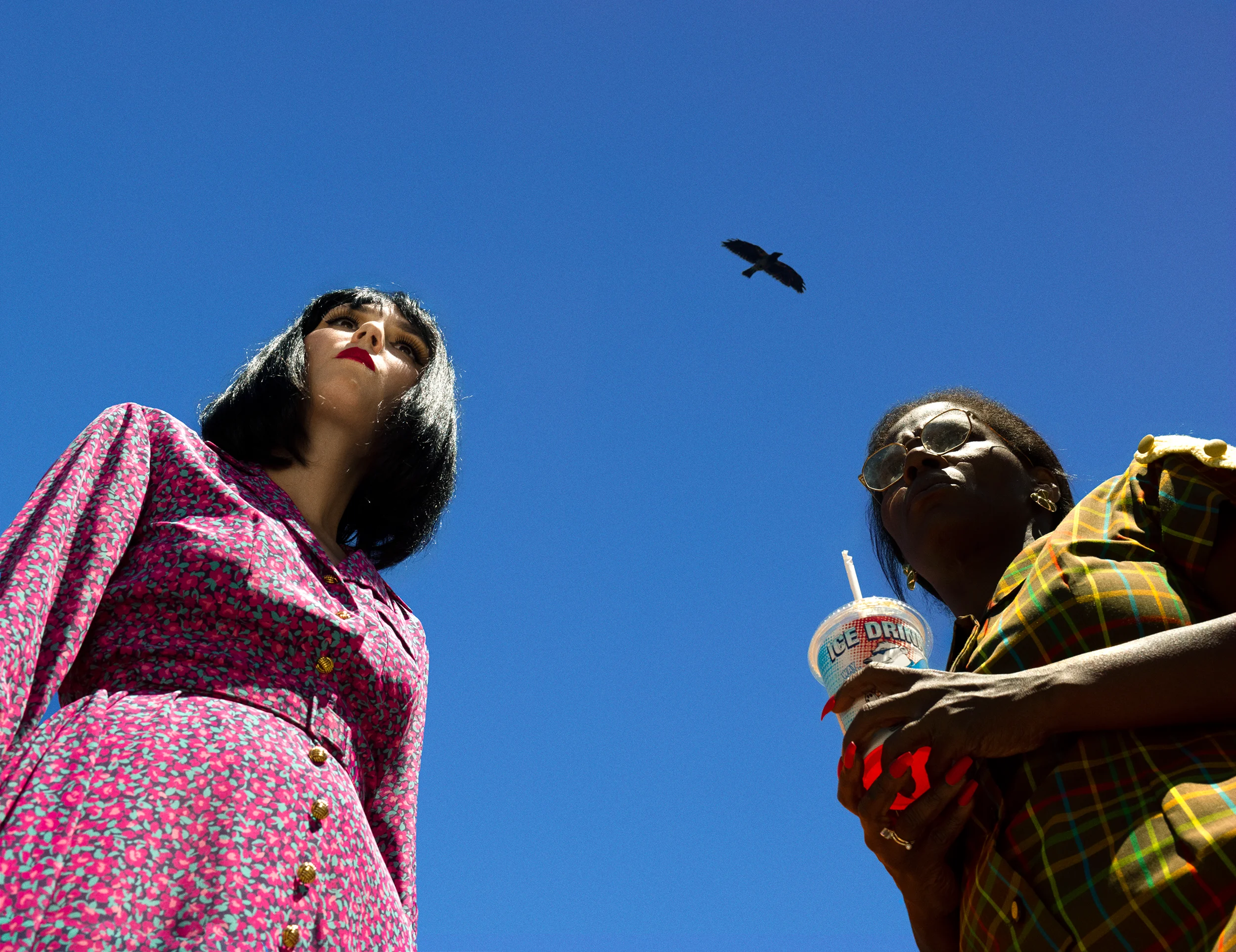 Pink, Prager muses, emerges as the defining color of the film and the photographs that she shot as part of the project. In one image, a woman dressed in a hot pink pencil skirt falls from the sky; in another, a close-up of a woman in heavy eyeliner sees her blow a sticky pink bubble from synthetic gum. This Technicolor world forms a fitting framework for the bigger questions that arise in “Run.”