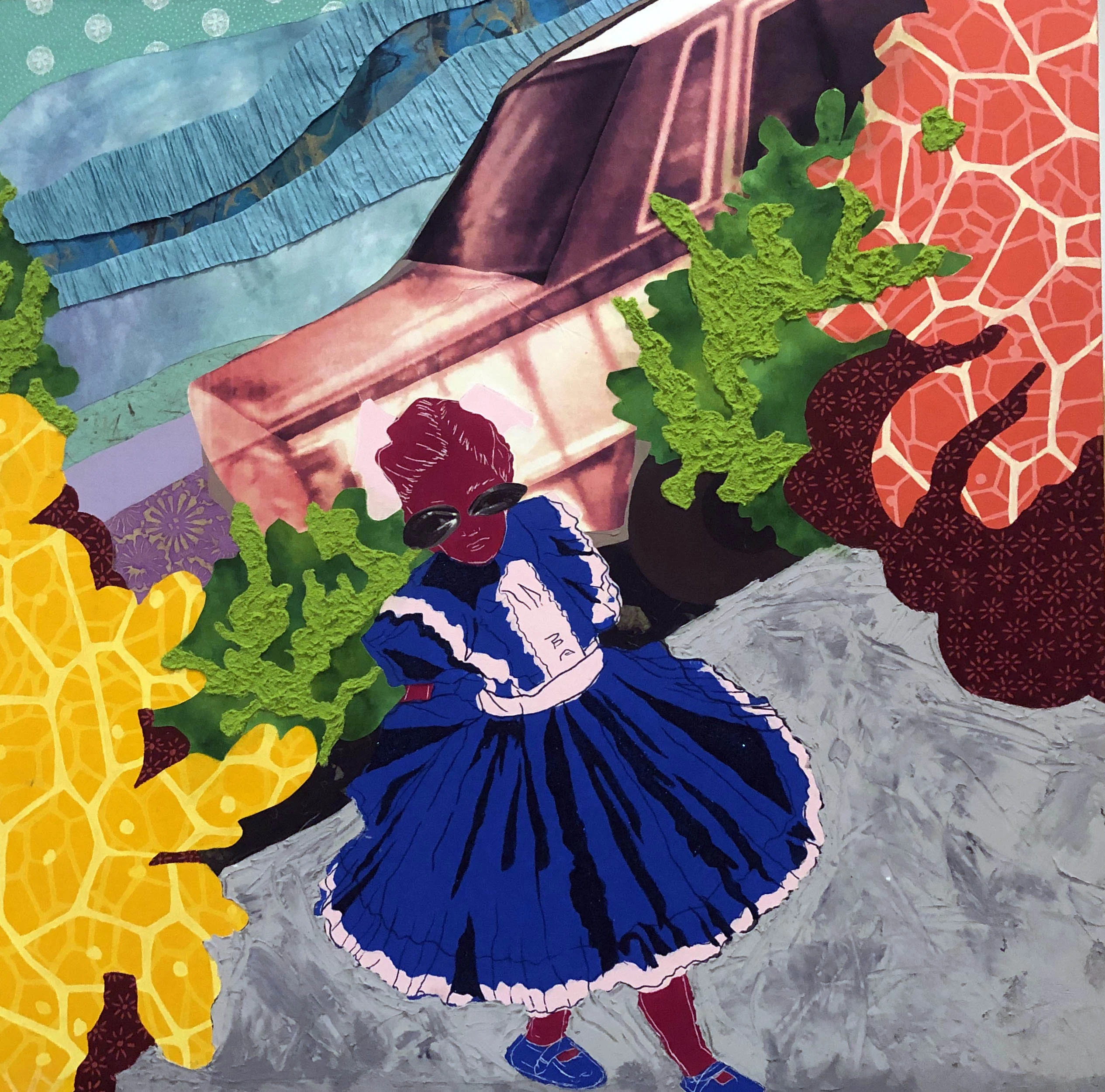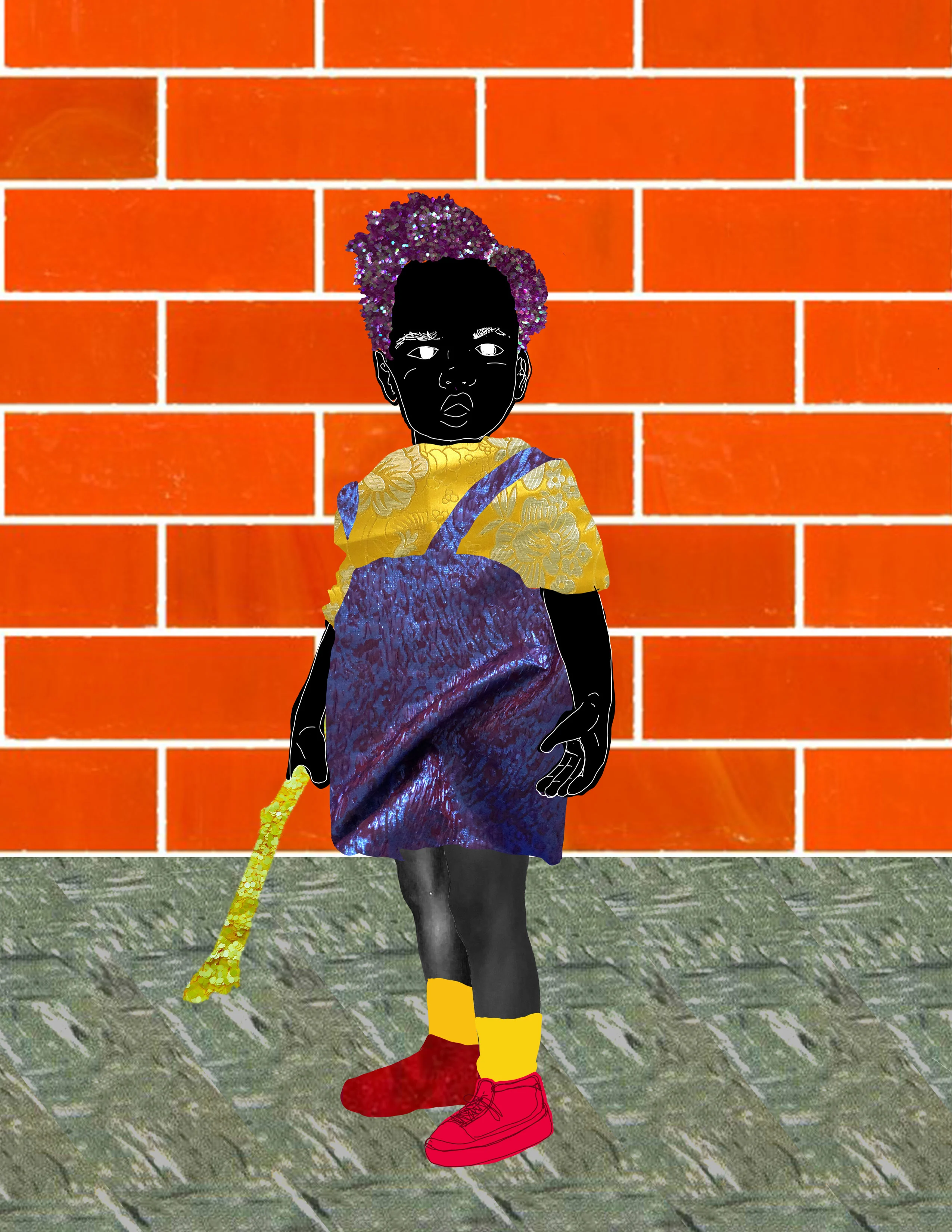 Cydne believes life is an amalgamation of different components and that there’s no one way to be in the world. This ethos informs her choice of materials, ranging from acrylic to decorative paper, photo collage, and texture elements such as glitter and sand. In her series “Generational Curses,” Cydne digitally altered photographs of herself and members of her family to examine how the “actions and personality traits of one member of the African diaspora can influence the way another member is perceived.” The piece “She Spells Her Cydne with a C (Study)” portrays a little girl with the hand of an adult cut out from a photograph. She’s holding a water bottle to her mouth, looking ahead. “In a family, it takes a moment to notice certain cycles,” says Cydne. “You can see how traits are developed in that environment.” The work’s title reflects such moments of realization and the presence of mind to rebel against the norm.