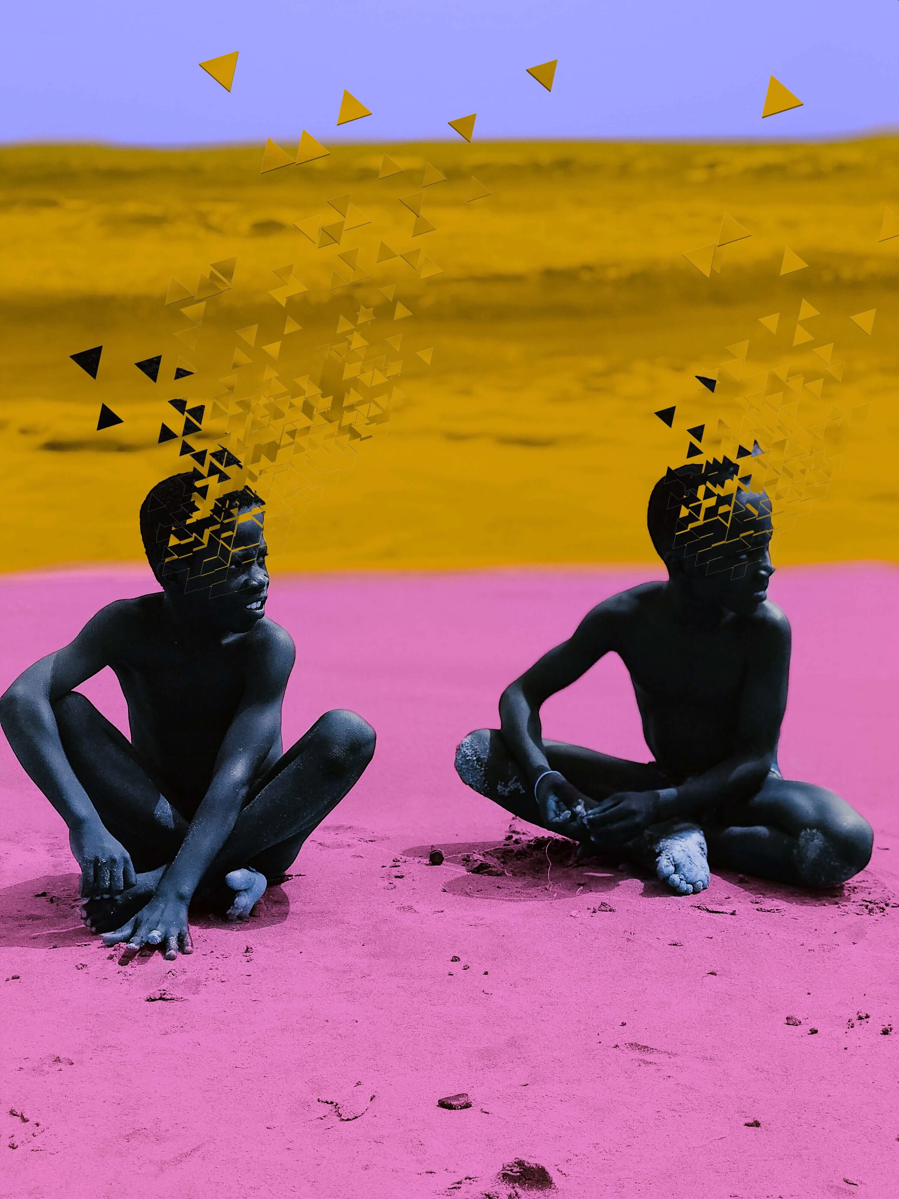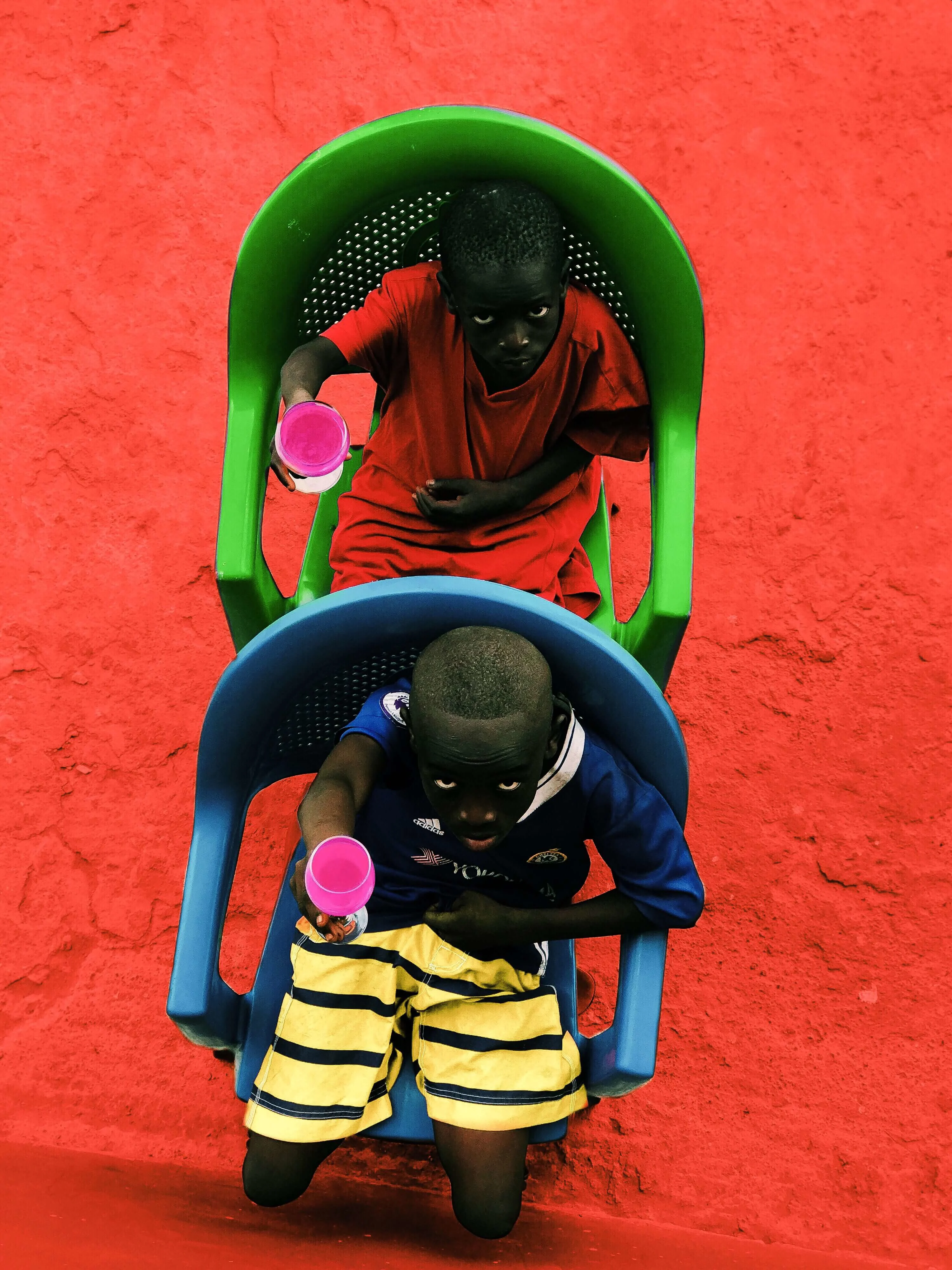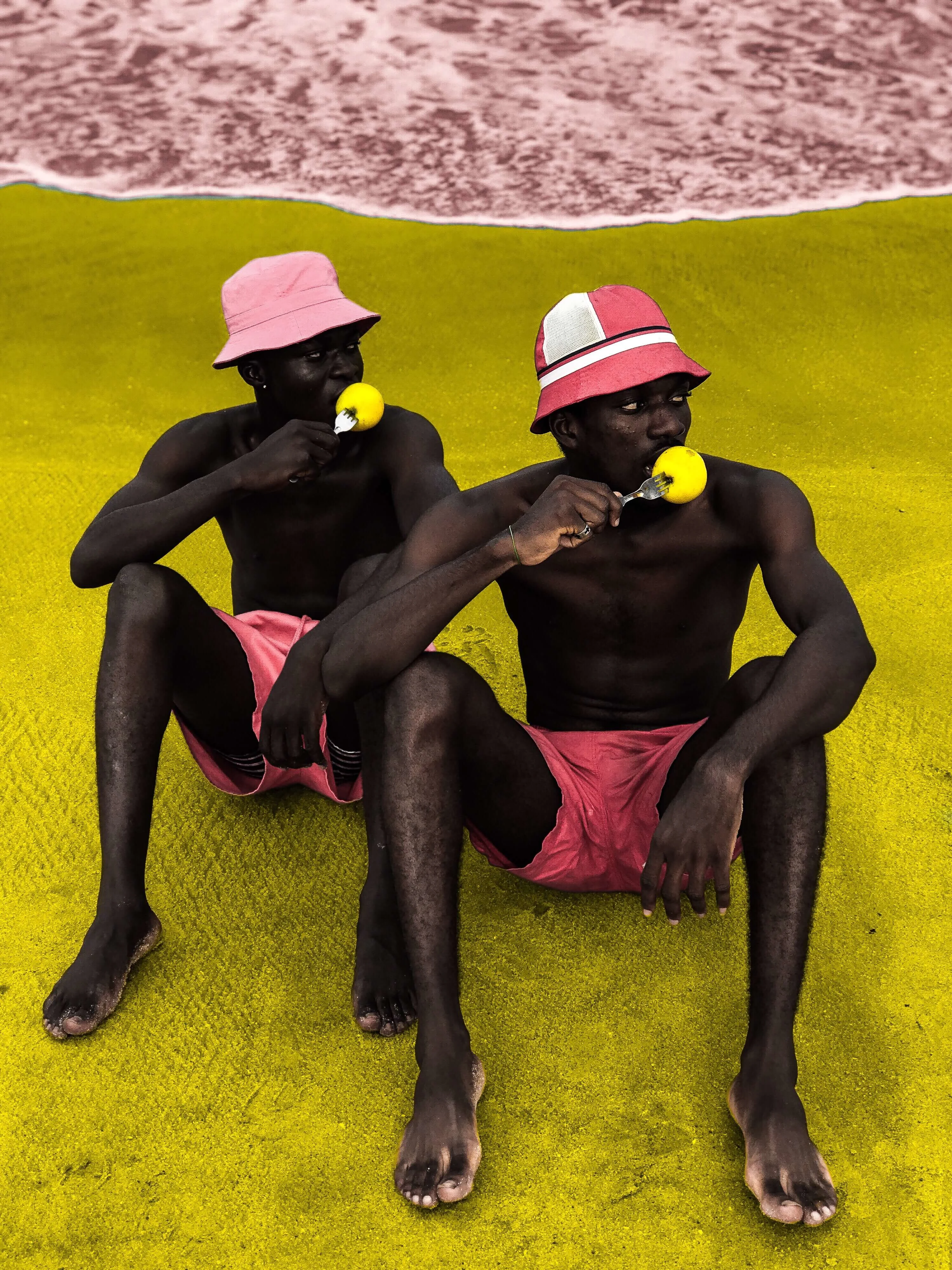 Once he’s taken the photos, Derrick uses Photoshop to add vibrant, punchy colors to each one, often calling upon those found in the Ghanaian flag. In the images, men and women clutch food and drink or hold everyday objects from newspapers to glasses to the sky against backdrops of bright yellows. Children play submerged in the sea, the water appearing in deep greens and reds. With this use of color, Derrick treads a line somewhere between photography and painting, and the results are captivating.