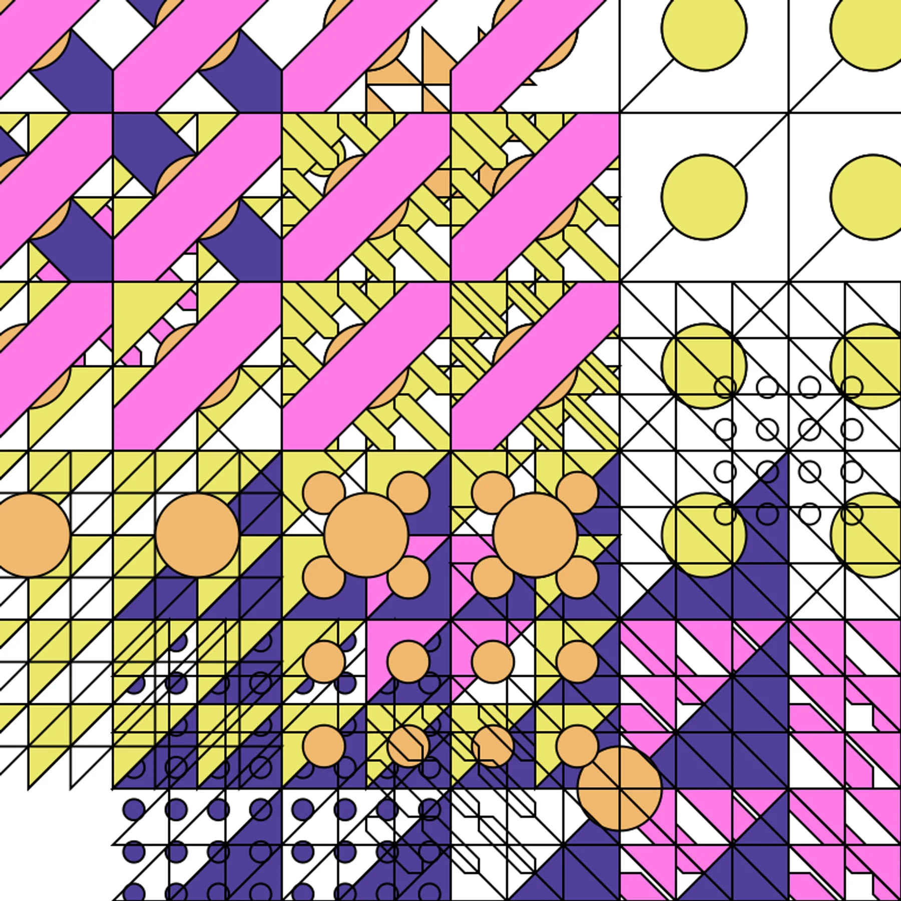 Freeke creates her artwork with code—often using Processing—and the ensuing designs document the incremental refinement of an artistic process and of growing and waning fascinations. The work is sometimes animated, but almost always variants on a theme within grids and alignments. “I have many rules like: which color do you pick? How many shapes?” The grids here become a sort of visual manifestation of coding constraints and frameworks. “Being aware of these rules so that you can sometimes break them is, I think, needed if you are being creative.”