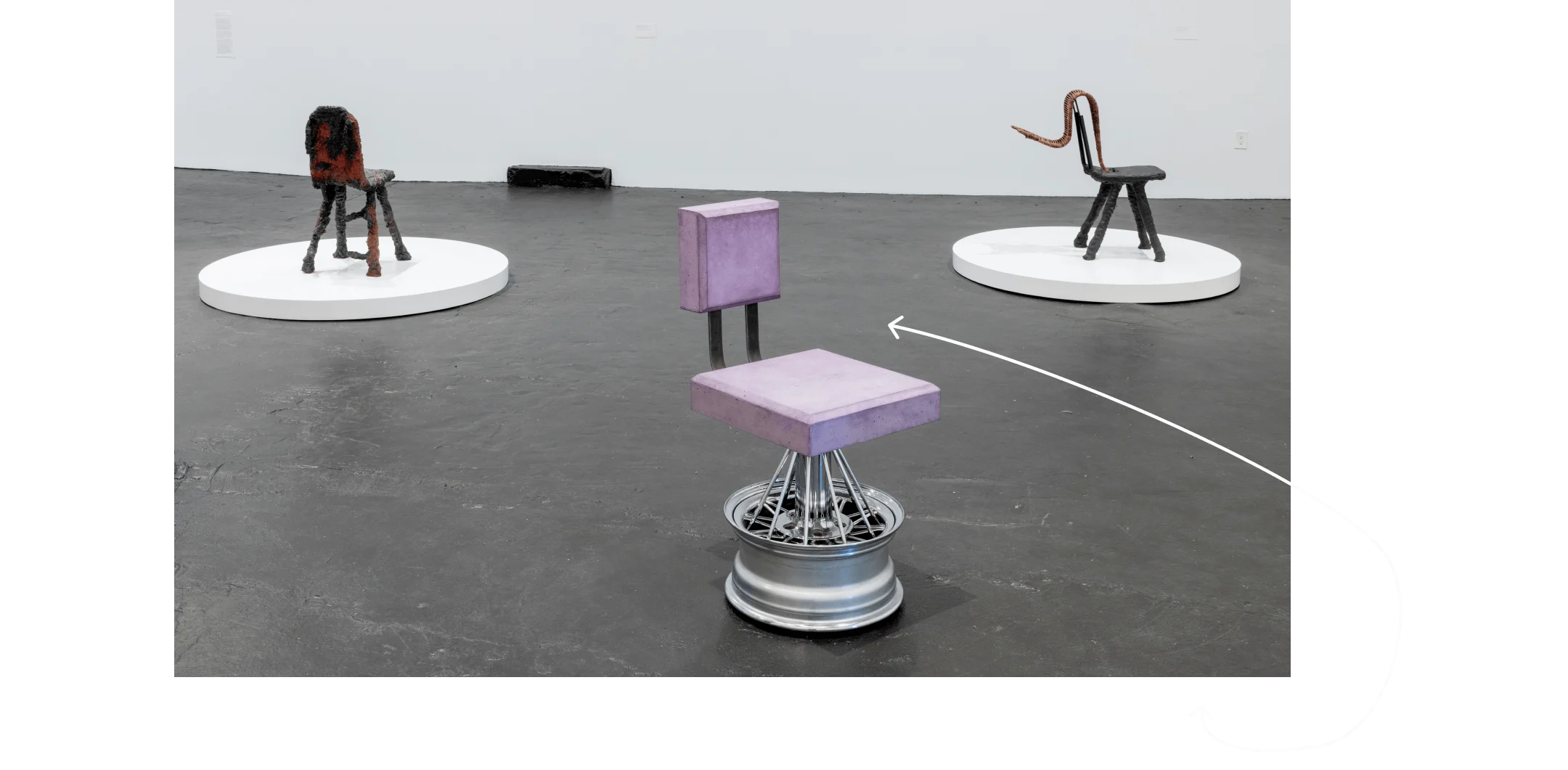 That ambition started to materialize after a friend invited Kanu to participate in a group show, organized in a vacant space. Gallerists took notice of his work, and he was subsequently invited to exhibit at the “Midtown” show at Lever House alongside artists like Scott Burton, who had inspired him so much. Kanu created a bench made from purple concrete slab hovering over two wire wheels (also known as swangas or elbows). The inspiration for the work came from the Slab car culture in Houston.