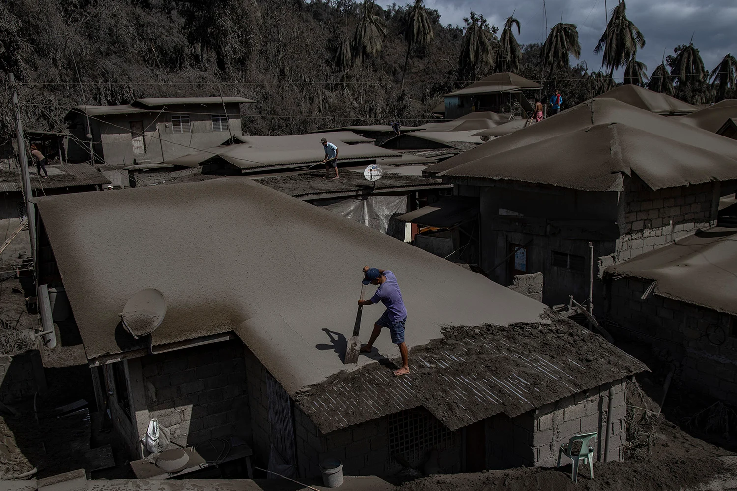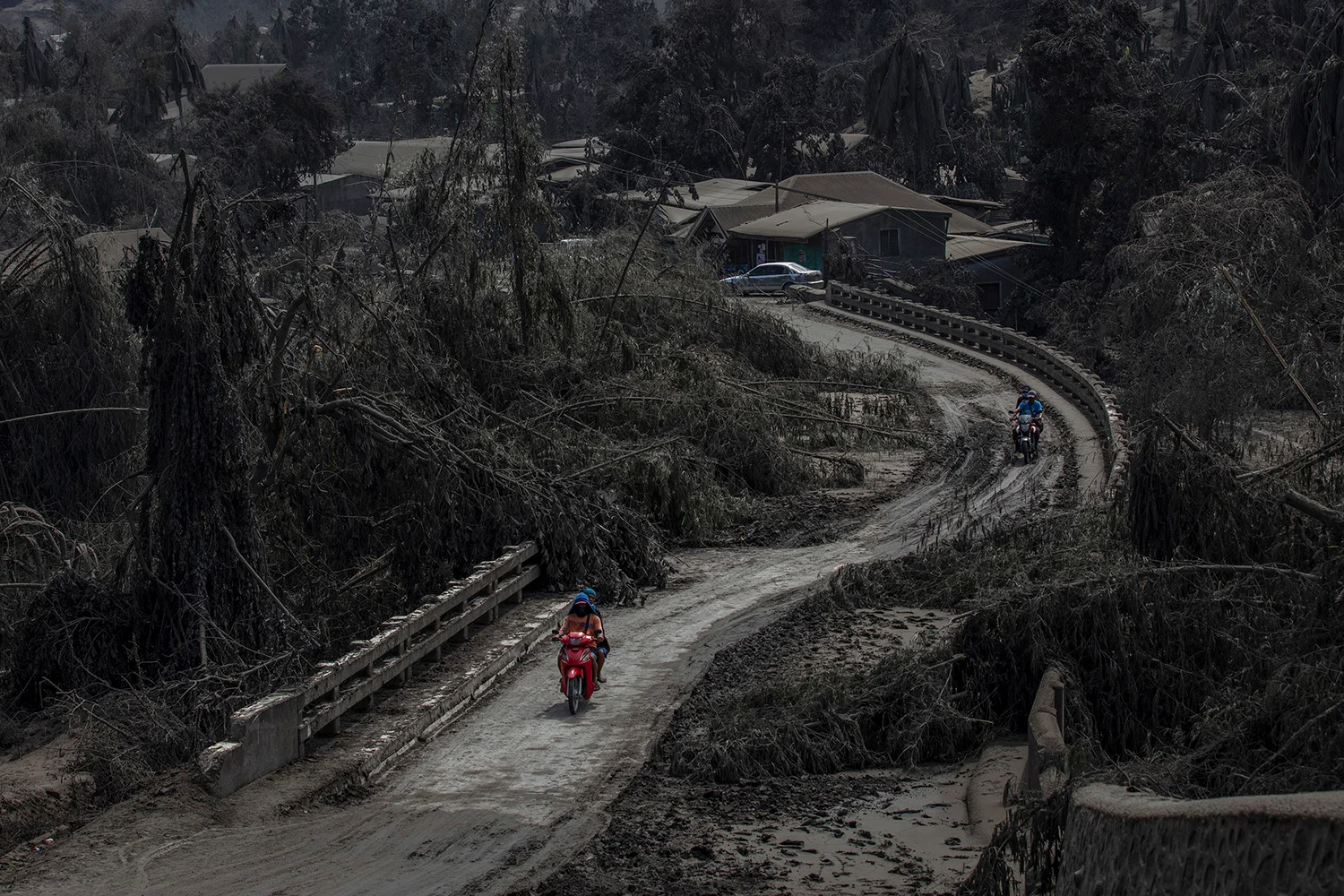 After that, it was evening, and the light was almost gone, so I decided to travel back up the ridge to Tagaytay, a bigger town where I could get supplies and find somewhere to stay the night. When I got there, there was no electricity, and everything was closed. I found a hotel, and requested a room as high up in the building as possible, so that I could see the events from there. Throughout the night, intense earthquakes would come every few minutes, and my room on the 23rd floor would shake violently. The next morning, I looked out the window and everything was just gray. Some of the photos look like they’ve been edited, but everything was just covered in ash.