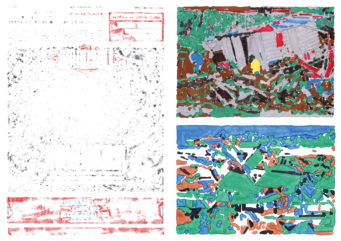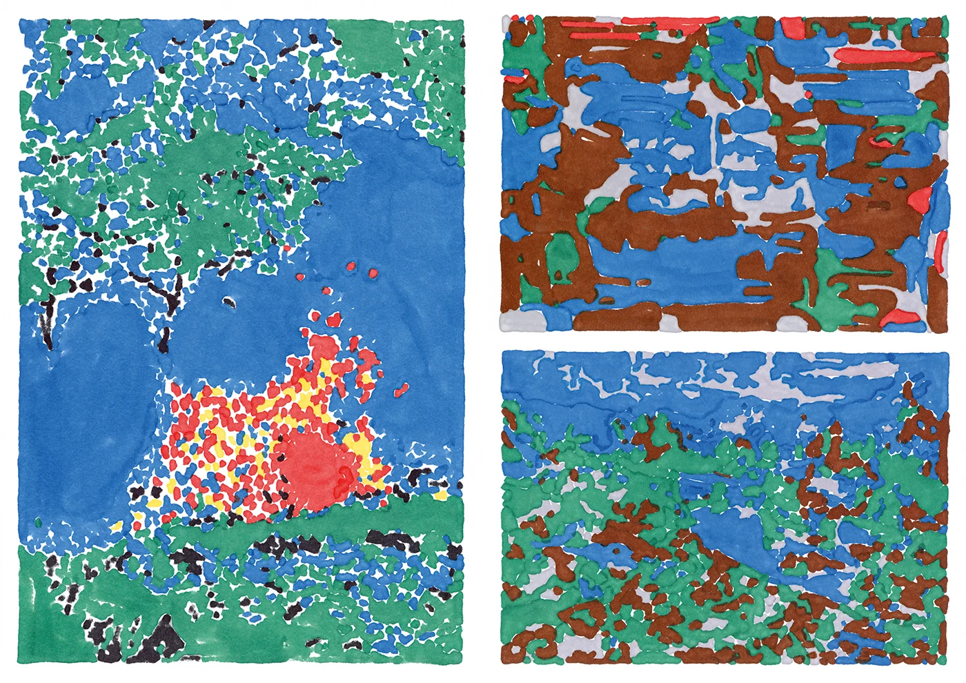 Her creative process draws a symbolic parallel with the characteristics of natural disasters. “These markers are very thick, and they’re often difficult to handle, because they tend to damage the paper. I wanted to take this aspect of the medium into account while making these illustrations that show ‘before and after’ images of sites hit by natural disasters, because the felt tip destroys a bit of my drawing. The result is less smooth and clean,” she says.
