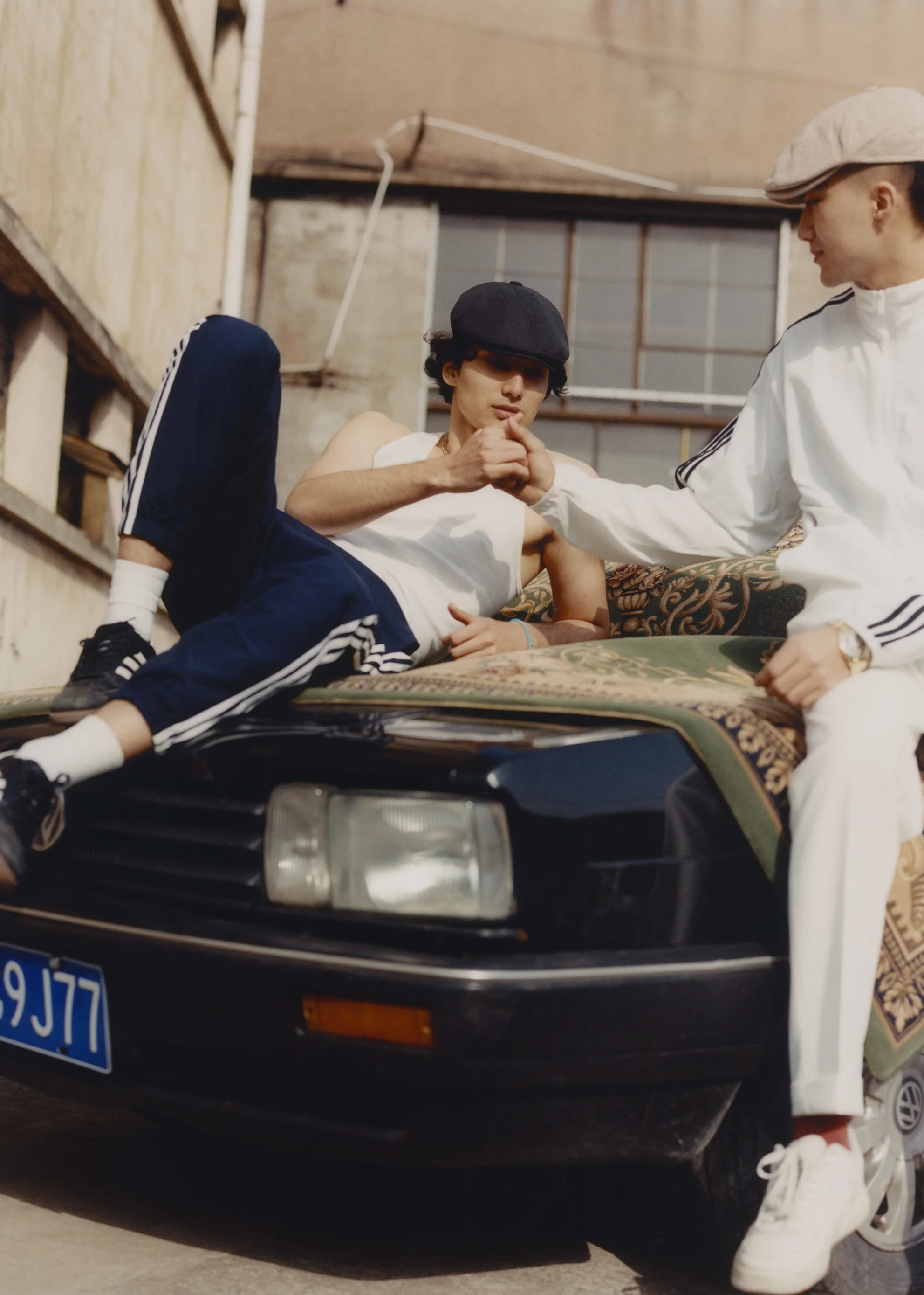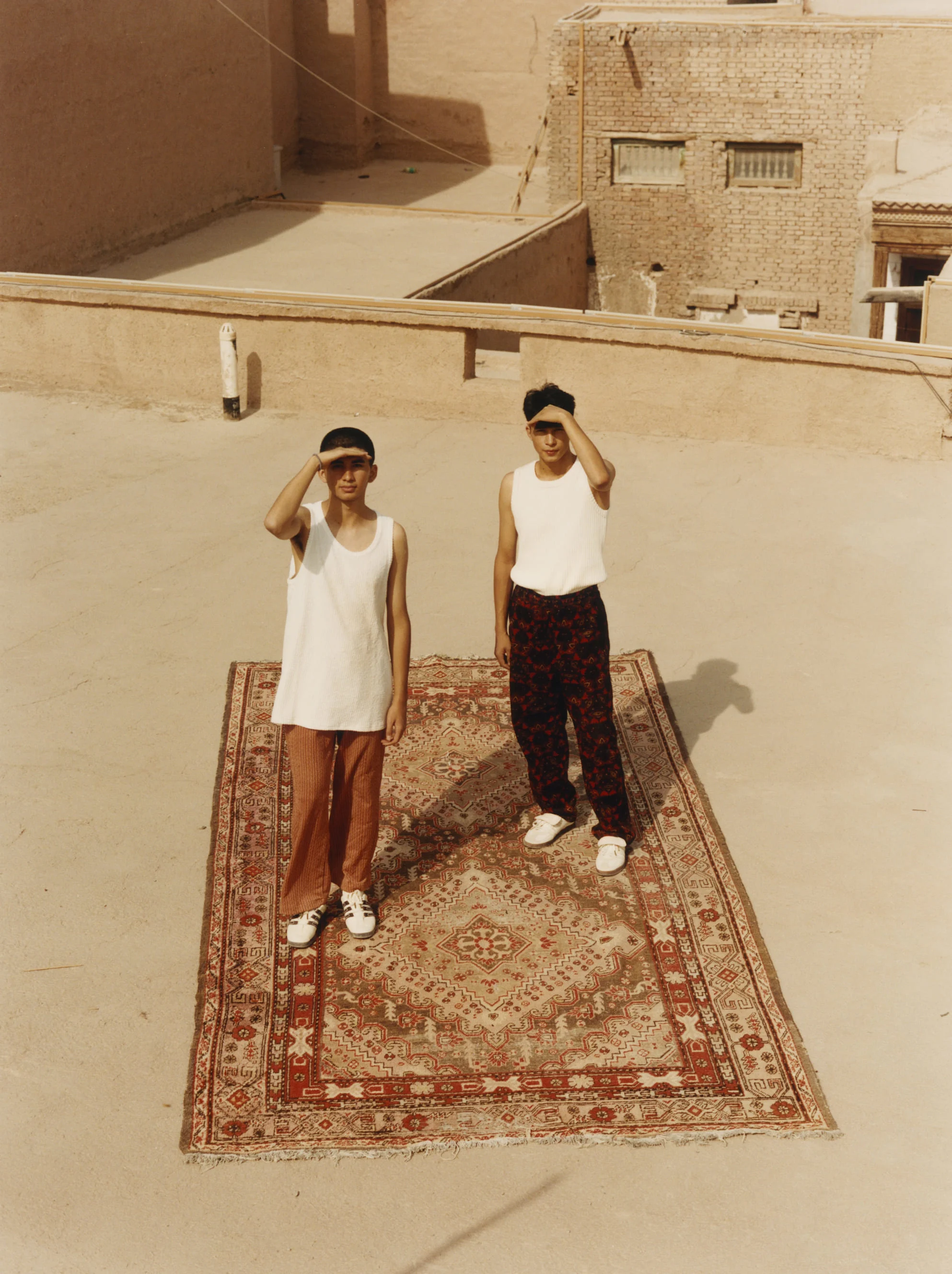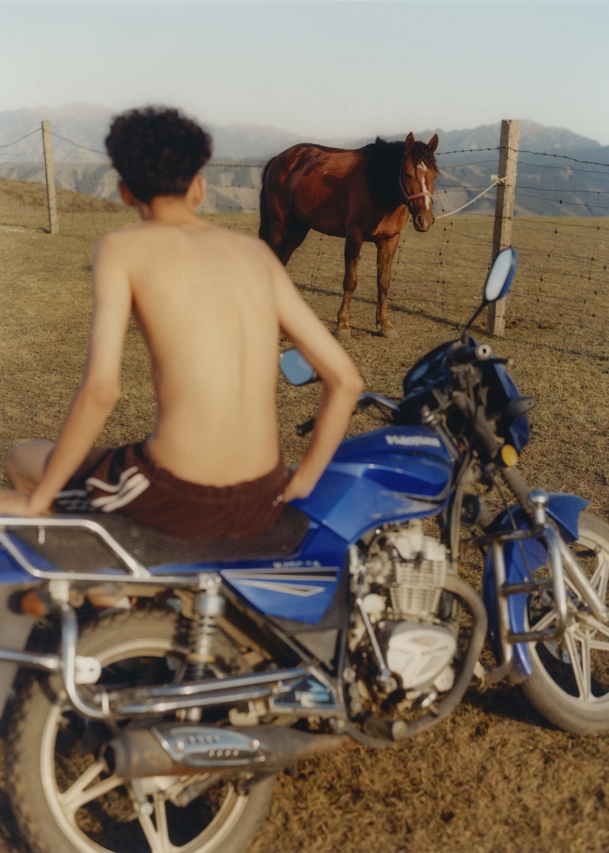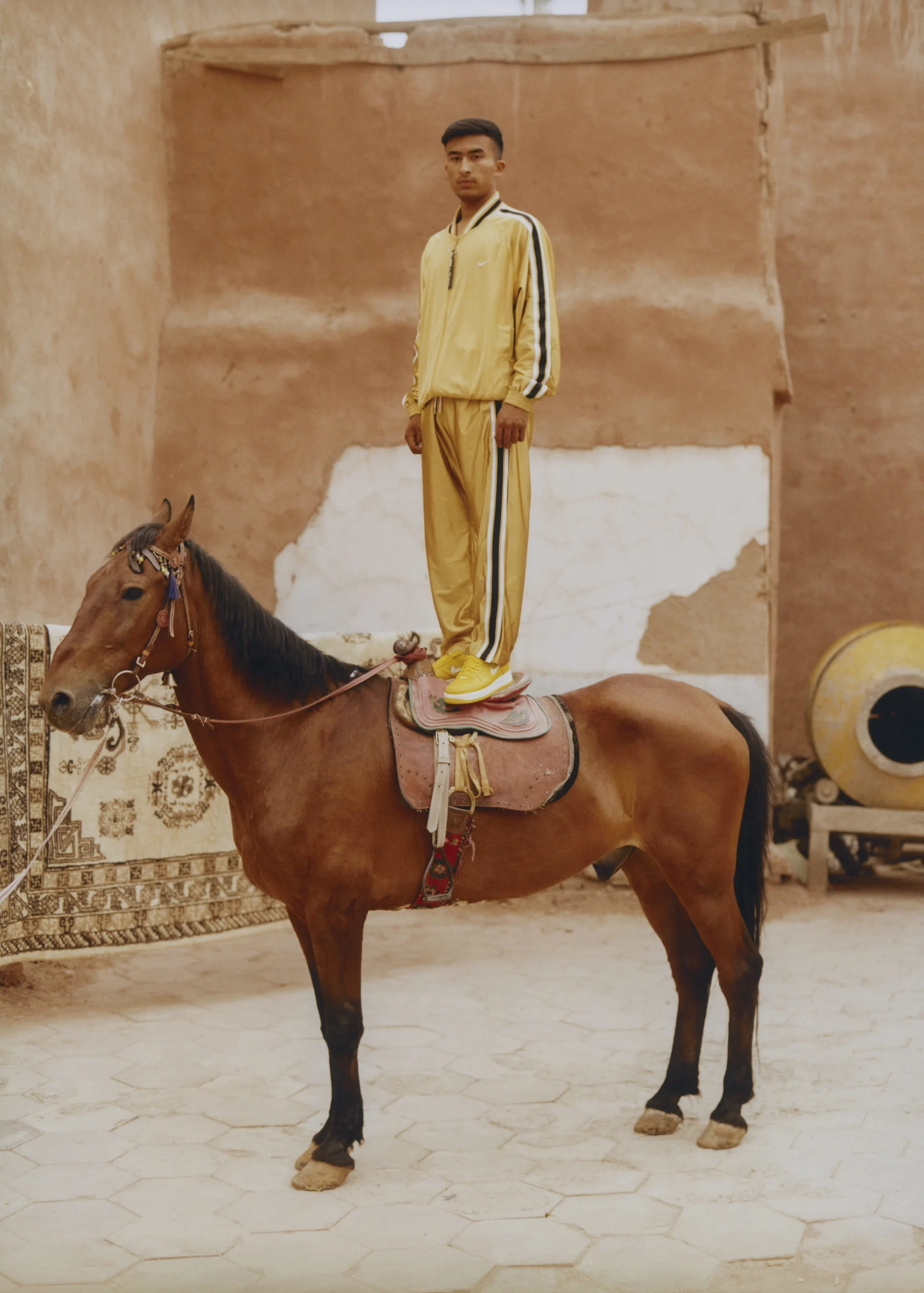 Ma focused on the lived aesthetics of her hometown. Women in Xinjiang, she explains, don’t grow up with brands or trends, but they wear the boldest colors and layers of accessories. “It’s loud. It’s colorful,” she says. “You can hear all the jewelry when someone walks past you.” In her photographs, boys in tracksuits appear alongside motorbikes and horses, foregrounded by rugs and textiles. These iconographic gestures move between old and new, East and West.