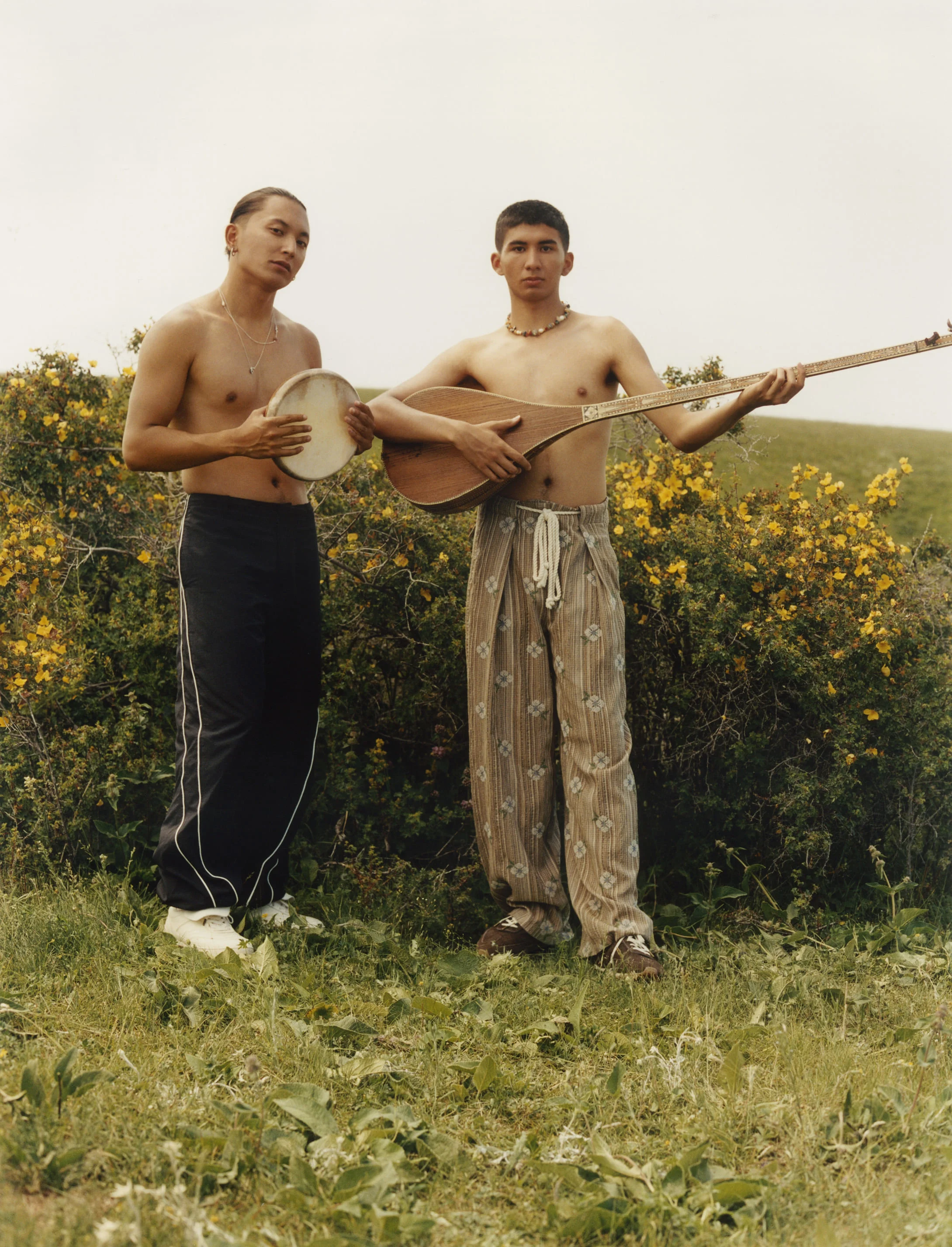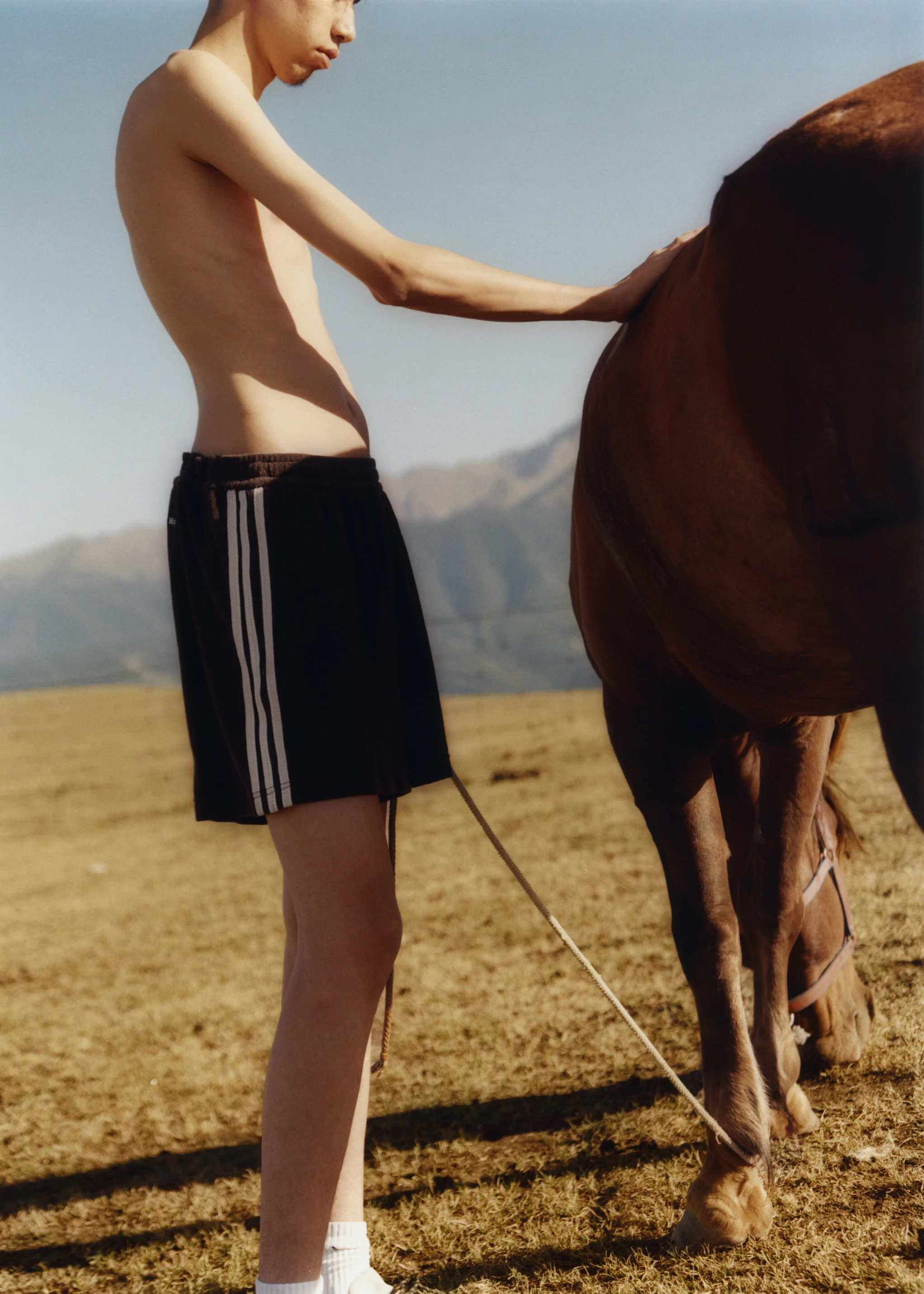 “I wanted to show that Xinjiang is cool,” she says. “Nobody associates Xinjiang with fashion, youth culture, or creativity. I wanted to change that.” One scene, for example, depicts a man on a motorbike amid the natural surroundings reminiscent of Ma’s upbringing, holding a bouquet of flowers—a visually stunning representation of motifs recurrent in the artist’s memories of Xinjiang. Elsewhere, girls skip ropes with sneakers and traditional braids swinging rhythmically in the town’s streets. Few of these photos feel real—Ma is intentionally stylistic in her approach. Young men standing on horses or playing traditional instruments in a field of flowers are not meant to document the mundane everyday, but quite the opposite. Ma intends to imagine possibilities not yet fully realised in her hometown, or at least the ones she never saw.