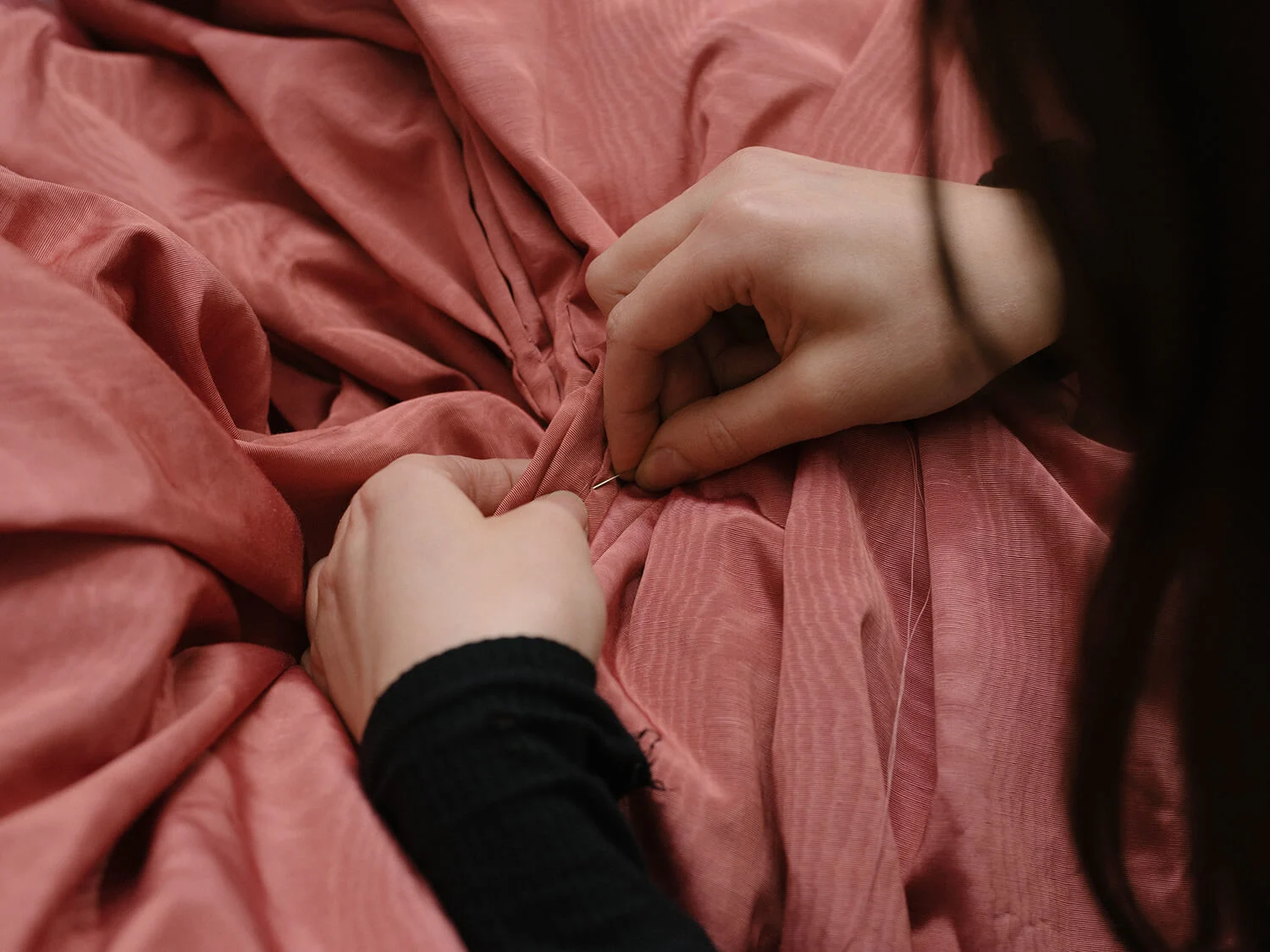You would be hard-pressed to describe the finished article in such terms; Reed’s collections are defined by a sense of grandiosity and drama, the pieces often large, demanding space. His aesthetic is now well-known, thanks to his 550,000 Instagram followers, a number at least in part down to the patronage of Harry Styles, who wore a custom-made Harris Reed crinoline gown in a cover story for American Vogue. A suit on top, a taffeta-and-tulle skirt beneath, it epitomized Reed’s work, where garments teeter between two worlds, without ever really landing in either—masculine and feminine, most famously, but also DIY and haute couture, his creations formed from leftover yards of deadstock tulle and sequins, or discarded wedding dresses found at Oxfam. It always returns to the act of dressing up, a preoccupation since childhood. “I’d be annoyingly draping something on my sister while bribing her with graham crackers.”
