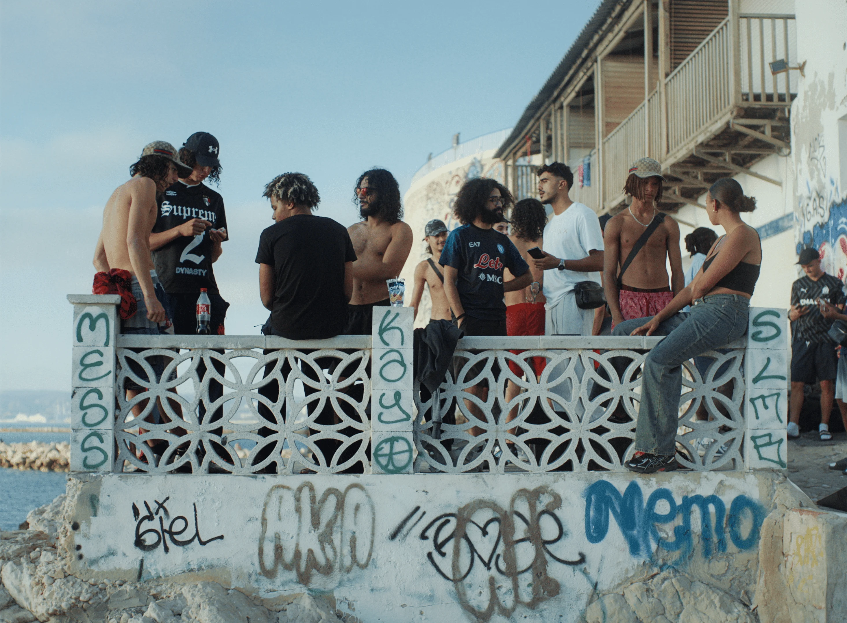 And so, Aponysus’ film, “Plongeurs,” was born. He spent a year going back and forth to Marseille, embedding himself in these boys’ lives from home to sea to recording studio. We follow five narrators: Mohammed, Reda, Fares, Alex and Milo. The film oscillates like a rubber band between themes of childhood and adulthood. One minute the boys are talking about the violence in the city, the weapons being carried and how easily a brawl can break out at a party. The next, they’re seen playfully somersaulting into the water, joking and laughing together. At one point, we see two brothers, who are drill rappers, adjusting each other’s balaclavas, and the next shot shows two boys holding hands before they leap from the rocks, revealing how easily toughness and tenderness coexist. Aponysus shows us the darker side of life some of these boys are being pulled into, the pressure placed on them to act a certain way, before showing us their true colors coming through.
