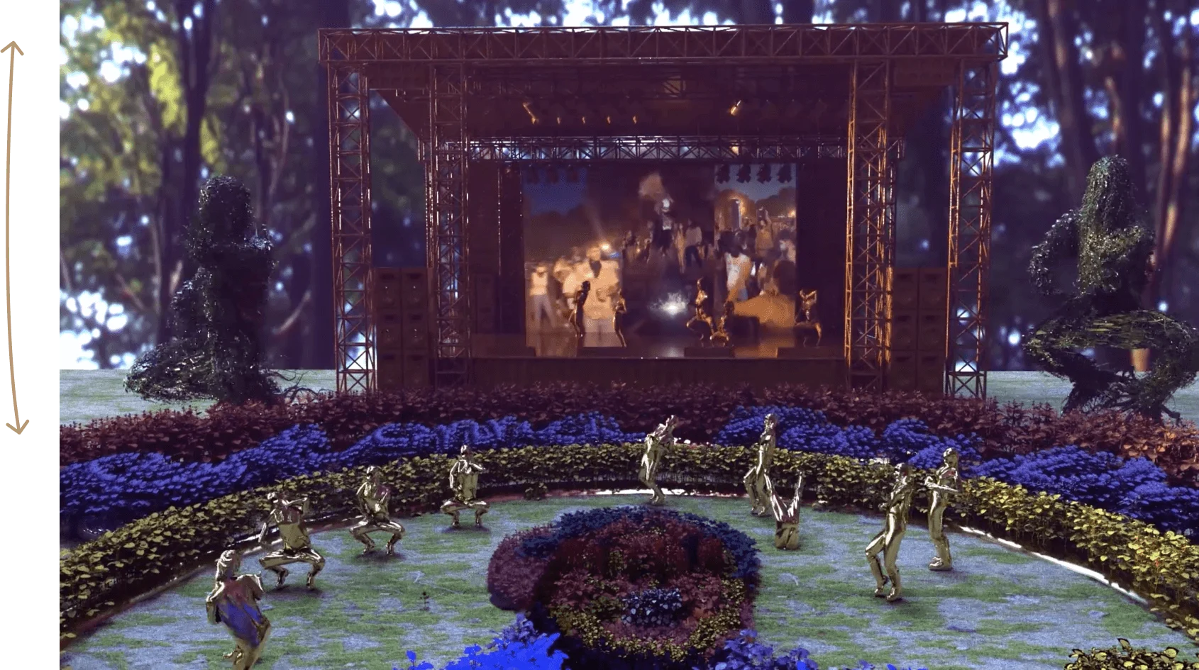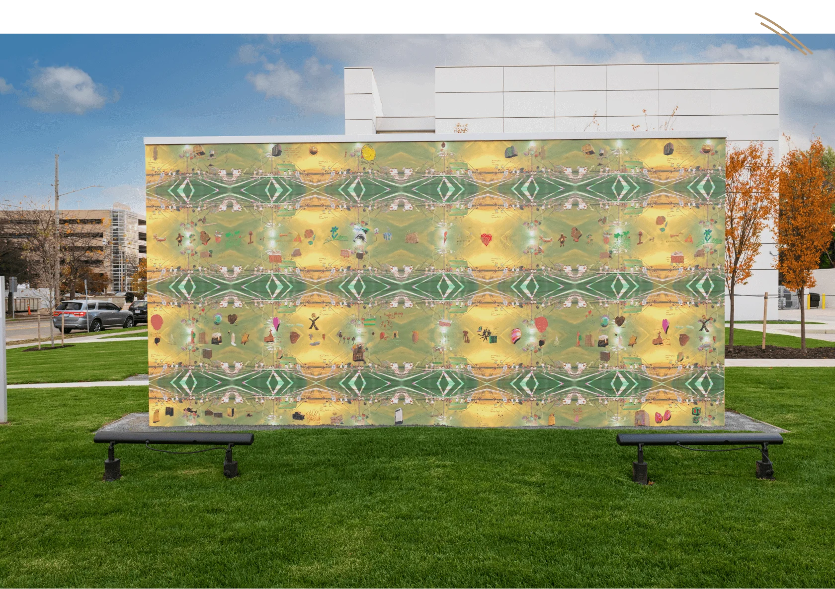 This practice of creating worlds is a recurring theme in Satterwhite’s work, and in a recent commission for the Cleveland Front Triennial titled “Dawn,” he worked with residents of the Fairfax neighborhood in Cleveland to make a public artwork for the Cleveland Clinic. Just as he collaborated with his mother’s drawings, he commissioned 100 people to create quick sketches representing their ideas of utopia, which he then brought to life digitally.