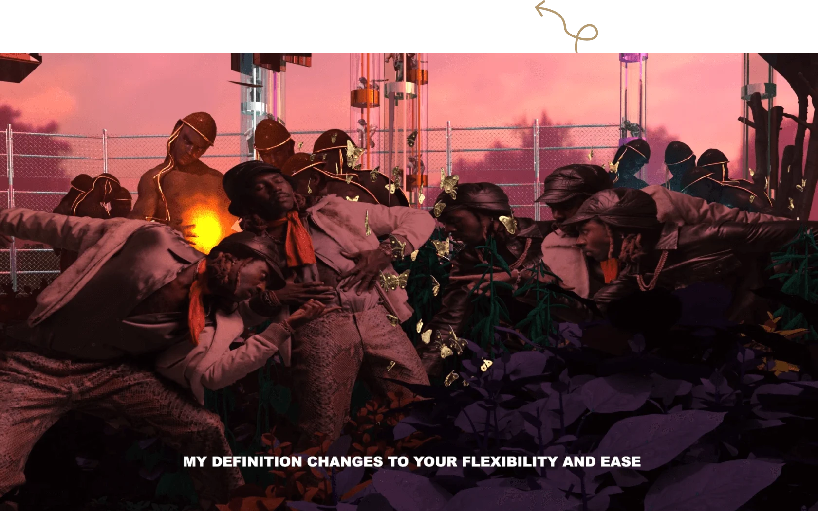 The accompanying visuals for the album include six 3D animated films collectively titled “Birds of Paradise” and three virtual reality films. The chapters of “Birds of Paradise” can also stand alone as individual works. For one chapter, “We Are in Hell When We Hurt Each Other” (2020), Satterwhite creates a utopian world where Black women have “peak agency,” and he depicts them as fembot-like figures fighting off adversity. The work was created during the period of protests surrounding the murders of George Floyd and Breonna Taylor.