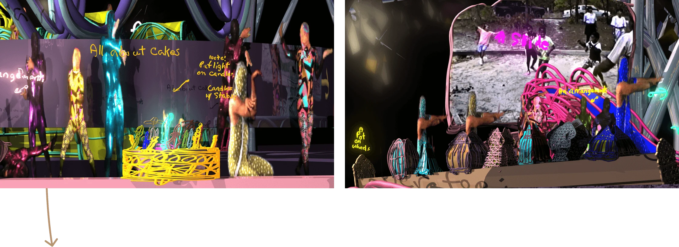 “My first attempt at trying to collaborate with her and find myself through her practice was actually making the objects in her drawings, performing the text, allowing the text to guide how to perform with those objects and creating a world building lexicon around this body of work that I inherited from her,” says Satterwhite. “It was sort of like a ritual. It was like carrying on an heirloom familial ritual to find myself.”