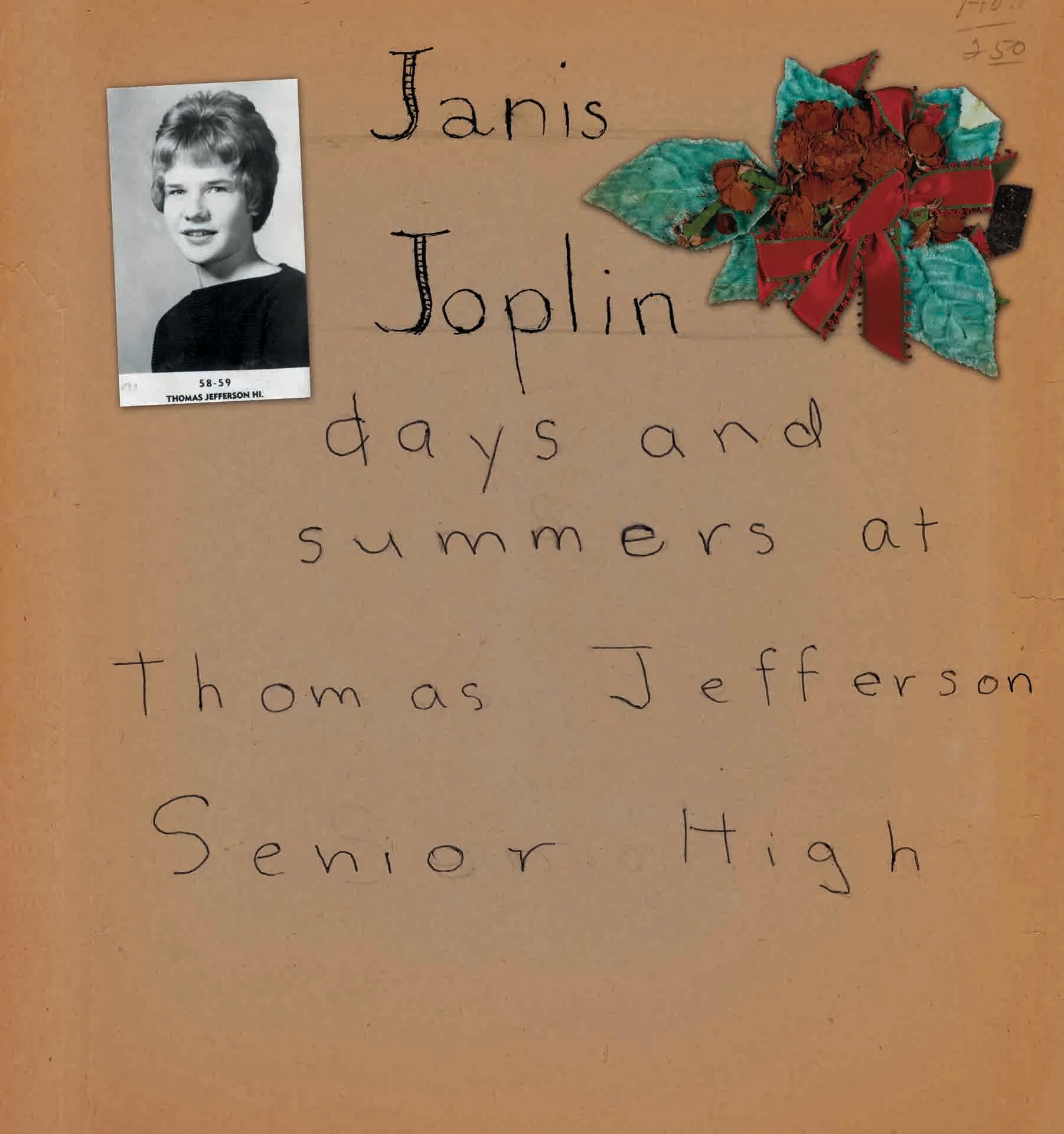 One of the most fascinating aspects of Days & Summers is seeing how the scrapbooks offered Janis an outlet for self-expression before she had really found her home in music. The fact that the musician was bullied for being an outsider in her Port Arthur Texas high school has been well-documented, but you wouldn’t necessarily be able to tell from her scrapbook pages. As reprinted in the book, Janis’ high school pages consist of a green and white gingham fabric swatch, in tribute to a dress her mother made her; playbills from school repertoire performances; a cut-out of a Valentine’s Day card featuring two cartoon hotdogs (Let’s be frank! I want YOU for my Valentine! – Joplin writes that she nearly fell off her chair when the teacher gave it to her); and newspaper clippings and various ephemera from basketball finals, cheerleader tryouts and the school election.