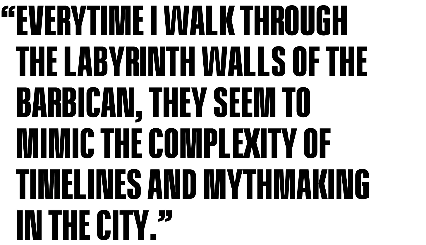 Each time I walk through the labyrinth walls of the Barbican, they seem to mimic the complexity of timelines and mythmaking in The City. The word barbican comes from the Low Latin word Barbecana: a fortified outpost, tower or gateway. At the advent of Julianknxx’s global chorus, staged and housed within these walls, I imagine new floodgates, undercurrents and structures holding testament without erasure. For me, the act of documenting and imagining is a catalyst for flight and self-determined futures, in a Black aesthetic language resonating far beyond the City walls and beyond the narrative of slavery.