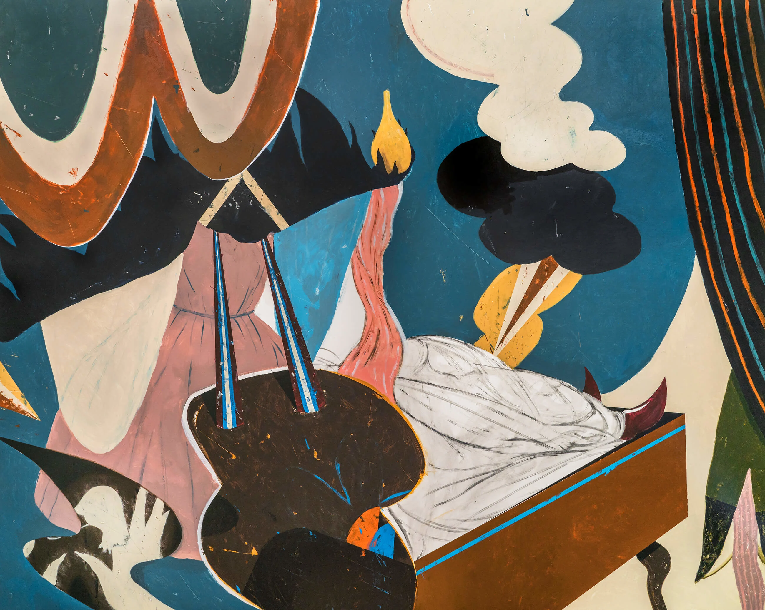 Kenichi’s work sits between two artistic styles, figurative and abstract. Like the line at the edge of the spotlight, one part is clear as day while the other lays in the shadows. At first it seems like a jostle between abstract shapes and swathes of color but as your eyes settle you notice distinct objects – a coffee pot, a vintage movie projector, a dagger – and lesser defined figures who act out dramas as if on stage.