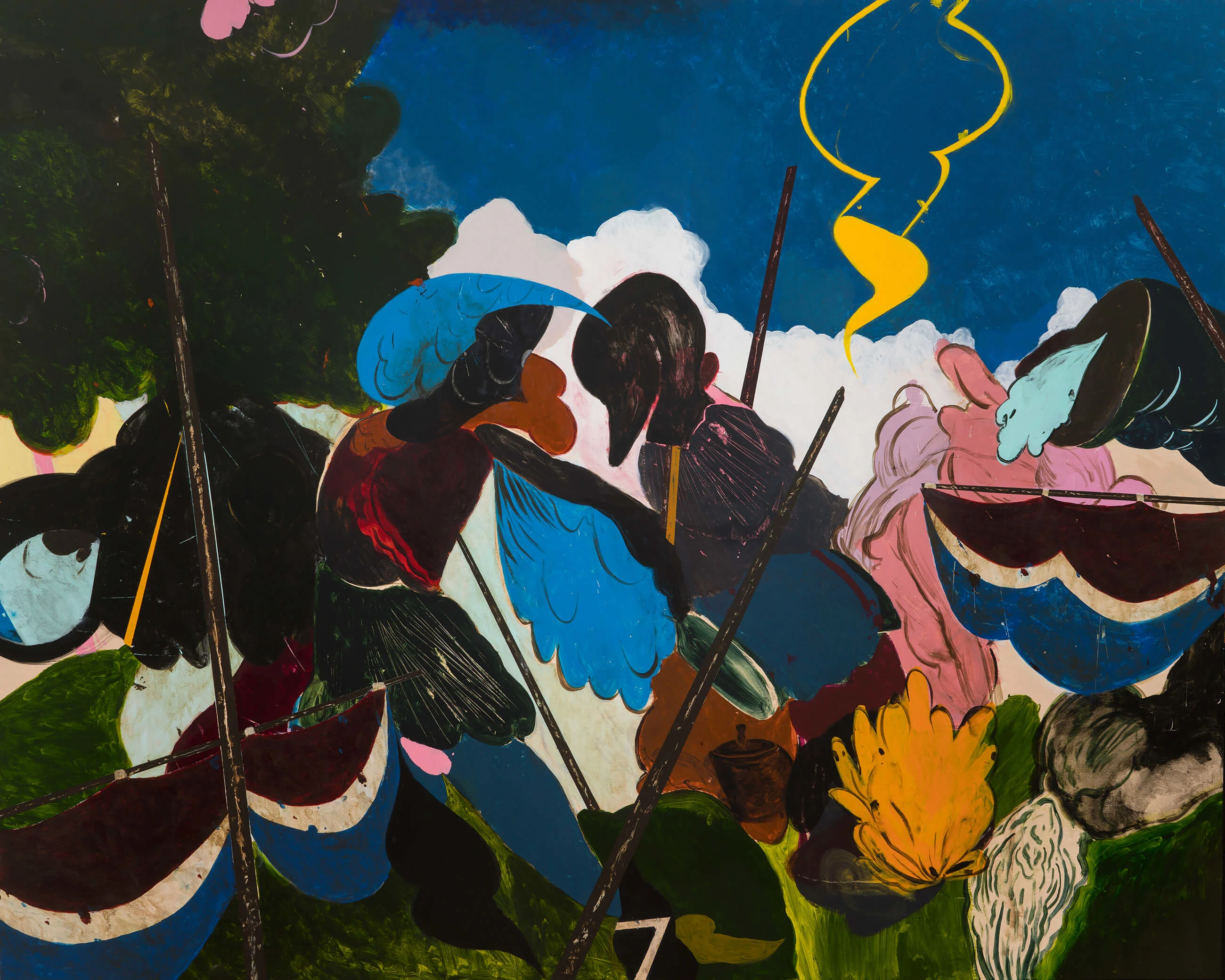 Theater sets, botched military campaigns, neglected wallpapers and nocturnal anxieties are among the ideas which have crept into Kenichi’s recent paintings. In The Search Party there’s a visible fly system rigged to lower the moon, or hoist cardboard trees offstage.