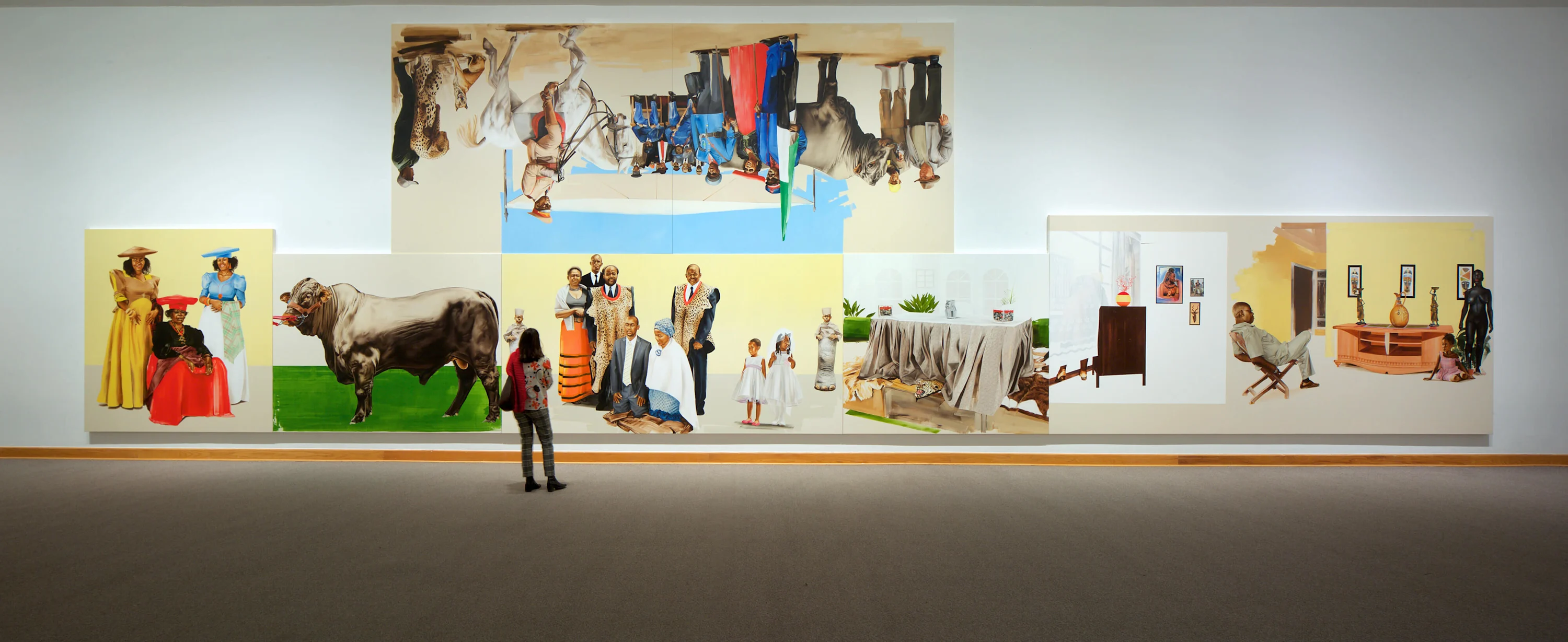 In one of the scenes from Motswana painter Meleko Mokgosi’s exhibition Bread, Butter, and Power a man lies on his back on an unmade bed in a sparse bedroom. His dusty backpack hangs from the wall and a hat lies on the floor. Across the gallery hangs an image of high school students grouped together for a photo in their maroon and white-striped ties and blazers.