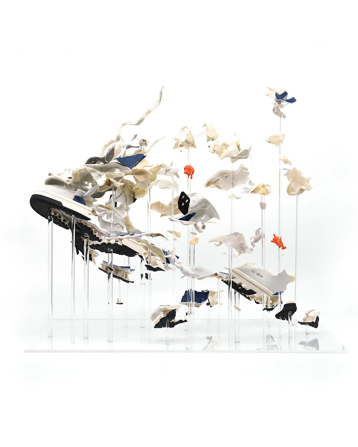 Melicka Fouri finds meaning in explosions. Her turbulent sculptural works use sneakers as a canvas to play with meticulous dissection and reconstruction, creating pieces varying from the diffuse to the self-contained: one is an intricate, hand-cut composite of dozens of magically floating fragments, visceral moments frozen in time, representing the first blush of excitement in a new friendship; another seems to implode before our eyes, disintegrating as if supremely weather-beaten, designed to evoke a sustained period of her depression, the piece’s innards bursting outwards even as it threatens to collapse in on itself like a dying star.
