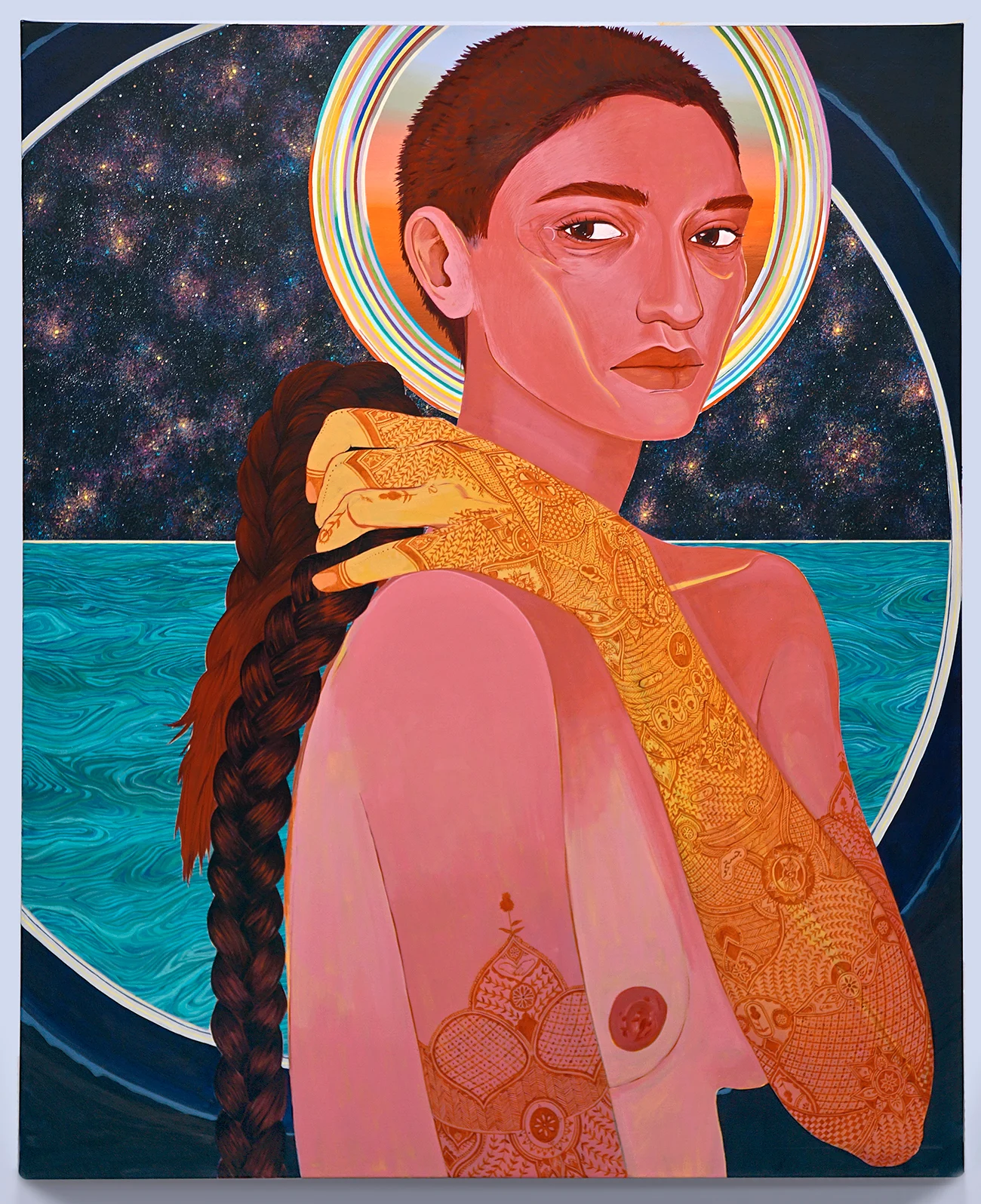 For women everywhere, hair is intertwined with identity. It’s both political and deeply personal. Nadia uses it in various ways as a weighted symbol. A thick, shining braid is a symbol of traditional beauty in Pakistan. In Nadia’s paintings her women wear long braids as a signifier of their culture, or they boldly chop them off in an act of defiance. “In Rite of Passage the posture is victorious but the turned head meant that maybe it’s not exactly what she wanted, or maybe she felt the pain that came with the disconnection,” Nadia explains. “In Moksha the figure is looking at us directly, cut braid in hand, saying “I cut this but I decide when to let go.” Her way of holding onto both worlds.” In Gender Reveal, the hair of the two women is braided together to represent “a bond that even if broken can be remade again, infinitely,” Nadia says.