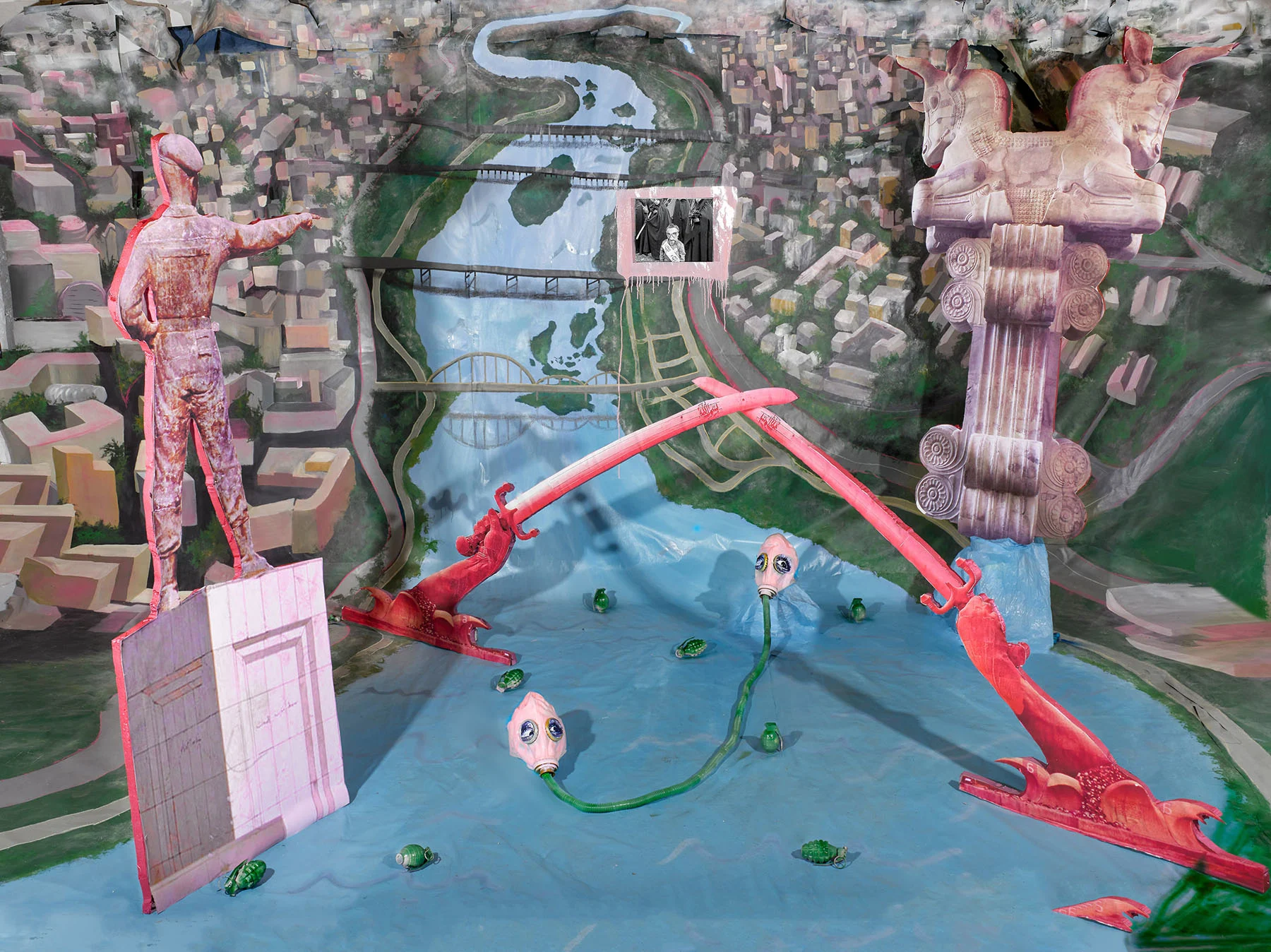 Experiential storytelling is the driving force behind Sheida Soleimani’s work. Sitting at the intersection of art and activism, she creates theatrical three-dimensional tableaus, hand-built in her studio. Each set is a vessel for critical perspective, unpicking the complex power dynamics and competing political narratives between the SWANA region and the West. The result is a patchwork of perspectives attempting to seduce the viewer into reckoning with their cultural blind spots. What is unique about Soleimani’s practice of resistance, refusal and critique is that it is accompanied by repair, care and compassion; the artist is also a federally licensed wildlife rehabilitator—a practice inherited from her mother—with an intake of 1,042 animals in 2023.