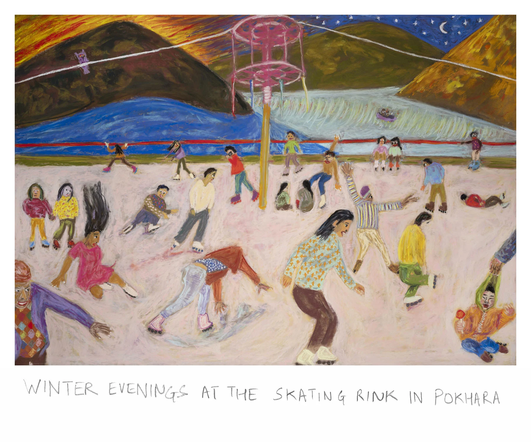 “The visual vocabulary for this project was more influenced by how I was looking at the world… there’s going to be humor, and there’s going to be violence. It’s a mixture because when I go out, that’s what I see,” he says. As an image frequency, pastels are gentler, almost innocent, but the subject can still be violent—drawings that speak about the ongoing war against Palestine, for example, or the toppling of the Babri Masjid, a mosque that was demolished by Hindu fundamentalists in 1992.