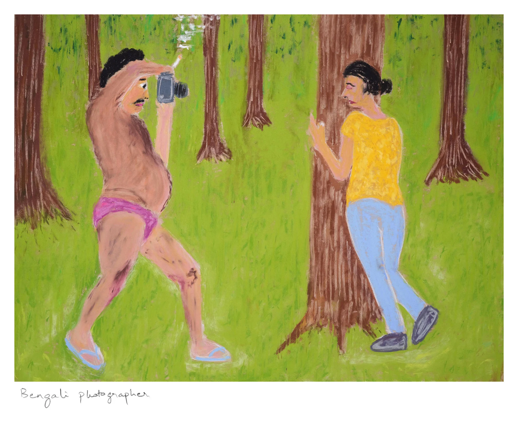 There is a sense of familiarity to the book as an object that urges a closer reading. The images are hand-titled in pencil and enclosed within a squidgy foam cover—reminiscent of the kinds of family albums we’d recognize from the 80s and 90s. The medium of pastel feels nostalgic, too, perhaps one of the earliest materials we are taught to draw with. The book is Hura’s “algorithm,” but it is also a blueprint, representing the random, and at times absurd, intersections of love, violence and humor that punctuate all of our lives.