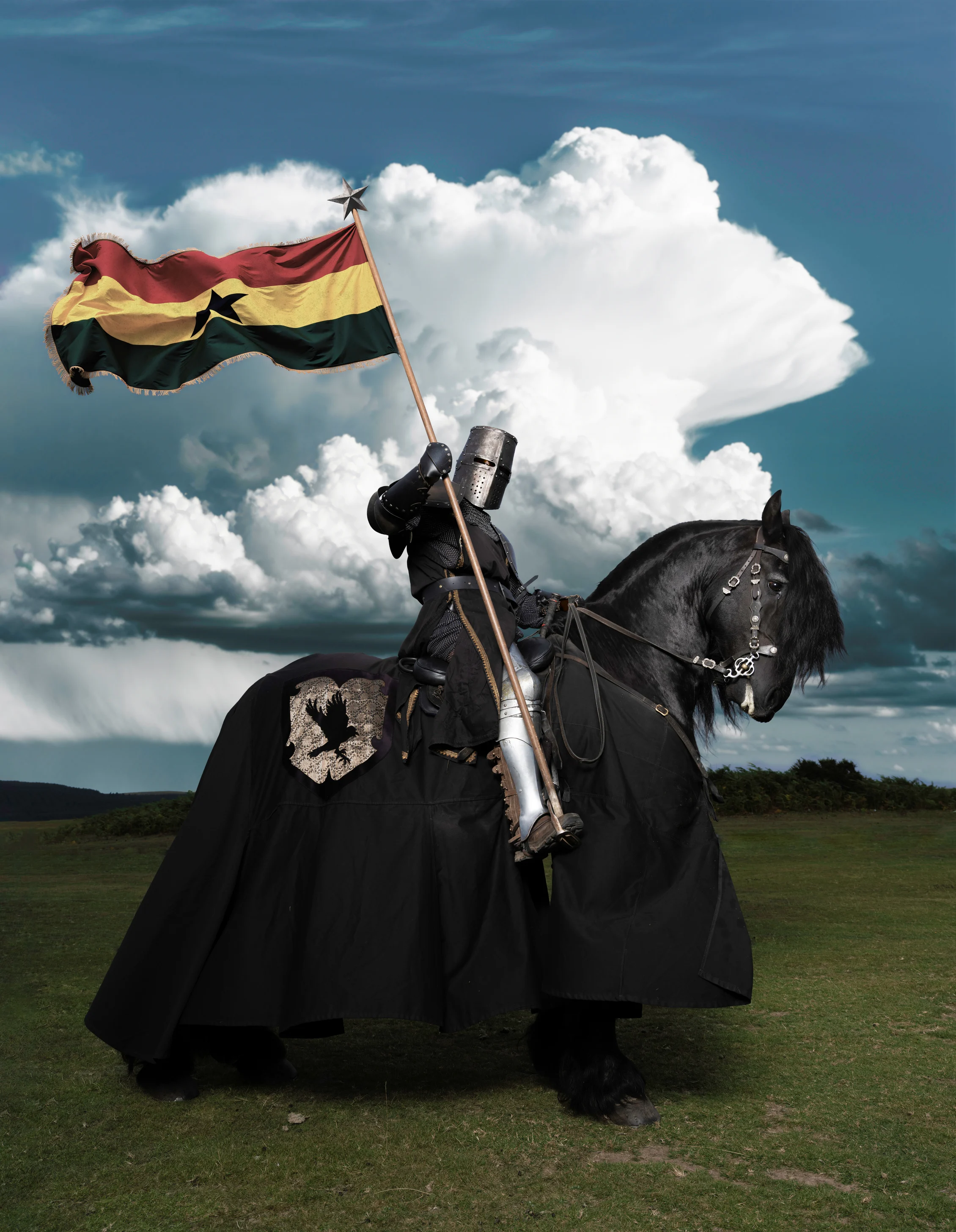 “To Be King” weaves together the perseverance of Black Brits and people of color in Britain through visual contrasts. A Ghanaian flag held aloft by a knighted Black figure on horseback places contemporary diasporic identity against antiquated perceptions of British dignity and nobility. Shot across Wales’ Hay-on-Wye, UAL, and Weil’s bedroom, the dynamic collection of photographs meld aesthetics, drawing inspiration from lived and collective experiences.