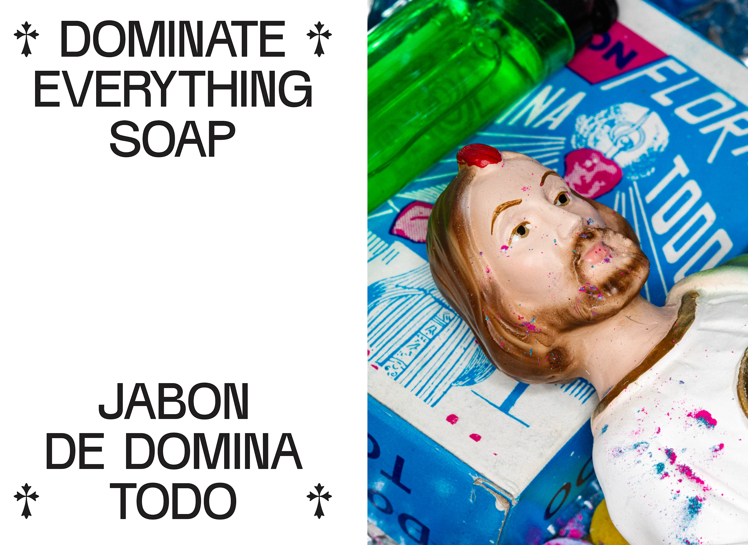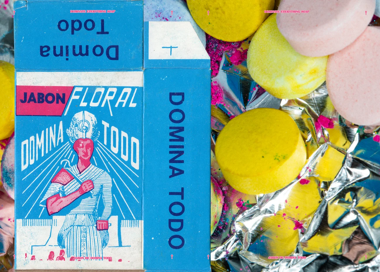 Throughout the process, certain soaps inspired particular narratives, with motifs imbued with intention for each composition. “Dominate Everything” becomes a story about addiction and criminal pursuits, incorporating pills, foil, lighters and the figure of San Judas Tadeo. Known traditionally as the patron saint of lost causes, he’s popular among the urban working class in Mexico and, against the church’s will, claimed by some criminals as their protector.