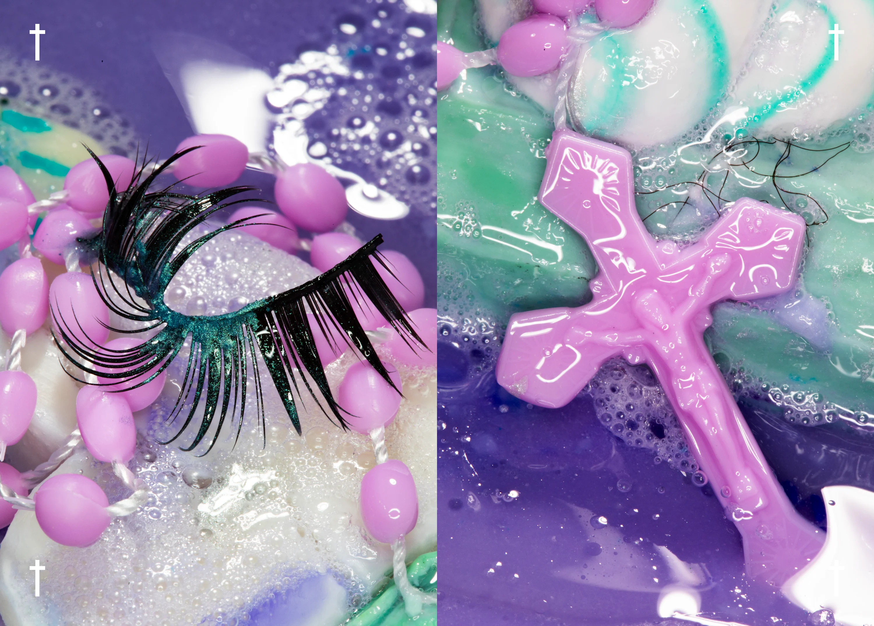 The book oscillates between dense compositions packed with objects and color playing a central role. Each soap’s visual world is anchored in its own palette, while recurring motifs such as rosary beads, miraculous medals, dirt, hair and bathing elements thread the images together alongside Tal Brosh’s illustrations.