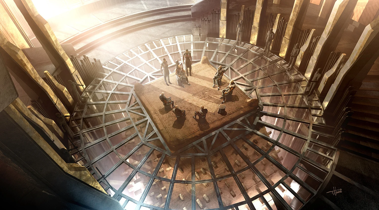 Till continues, “This symbiosis of ancient and modern elements is continued inside T'Challa's palace. There is an ancient temple embedded in the council room. The tribal council is still held on top of that old temple, like it might have been done in ancient times, but it is aligned with a modern glass floor, preserving the heritage, integrating it, making it part of the modern world without harming it.”