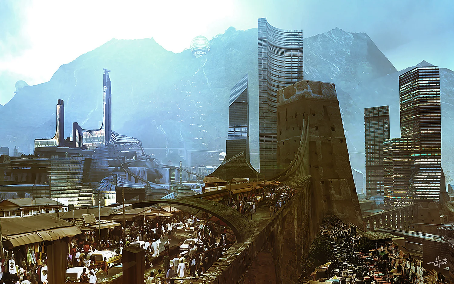 “We studied an enormous amount of traditional African buildings, art and design,” Till says. “Hannah wanted the flowing, repetitive patterns of traditional African textiles to be the inspiration for the city’s footprint, so they became the basis of a curvy street layout and the intertwined layered terraces of the palace.”
