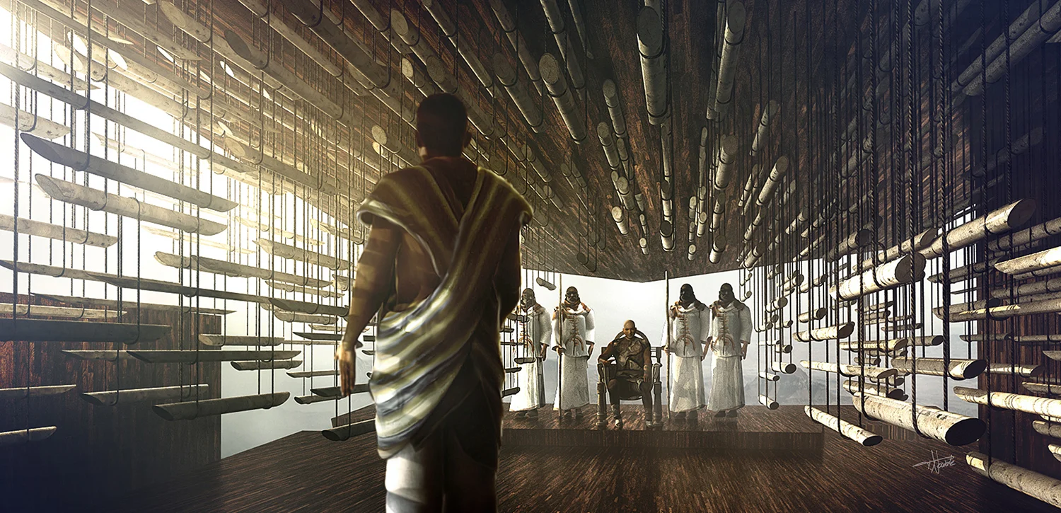“One of the most exciting, and most challenging tasks was the design of M'Baku's throne room. Hannah had a very strong idea of wood that was aligned parallel, pointing to M'Baku's throne to express his power, as well as his relation to his tribe and the environment. It was a very powerful image, but it wasn't initially clear how it could be executed.