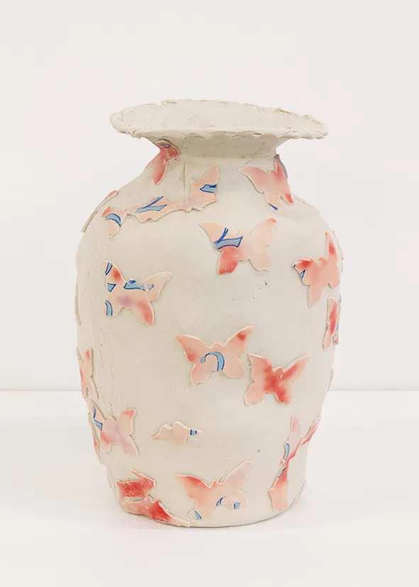In general, it’s easier to describe the pots and their design using contemporary technical analogies than the traditional or folky terms ceramic art tends to evoke. “The process is very analog, but it keeps this air of computer editing,” Trevor explains, “which I find interesting for ceramics, and is very much based in these centuries-old processes.” It feels right then to liken a particular blue he uses to the bright blue of a hyperlink than to the blue of Delftware or Wedgwood. It’s “electric blue,” he helpfully clarified. On other vessels, bitmapped photographic images sit starkly against airbrushed textures as if lassoed and layered on Photoshop. It all looks very now. Fuck knows what the future will make of them.