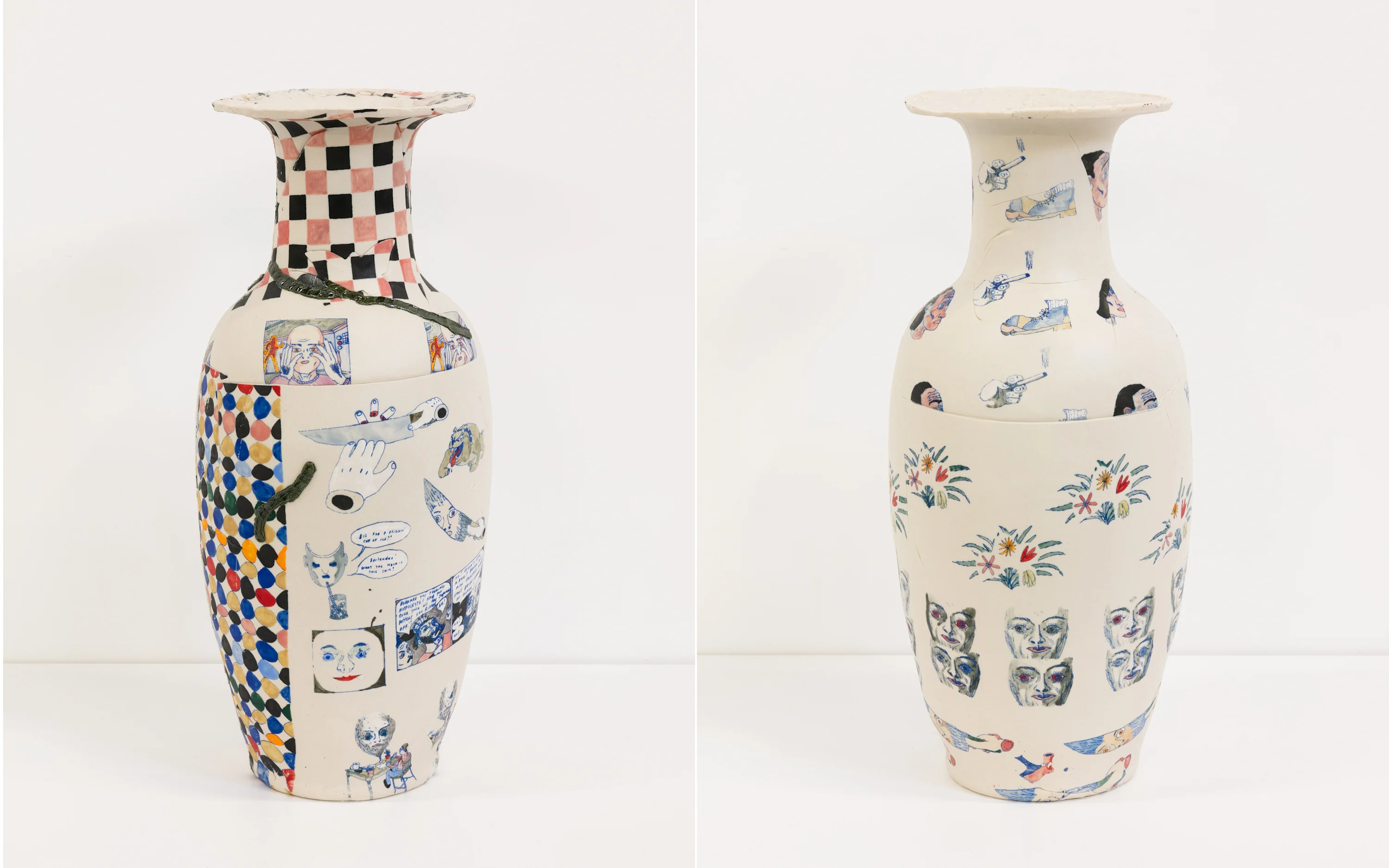 Each visual might be interpreted for its symbolic meaning – a rose, liquid pouring from a bucket, a hand holding a cigarette, an open window – but it’s the individual frames from comics or the figures drawn mid-action, like a cell from an animation, that suggest a narrative. It’s impossible to tell where the story starts or ends. The composition of these elements on each vase looks both accidental and purposeful – a cross between the responsive but haphazard grid of Google image search results and the sketch book pages of a chronic doodler.