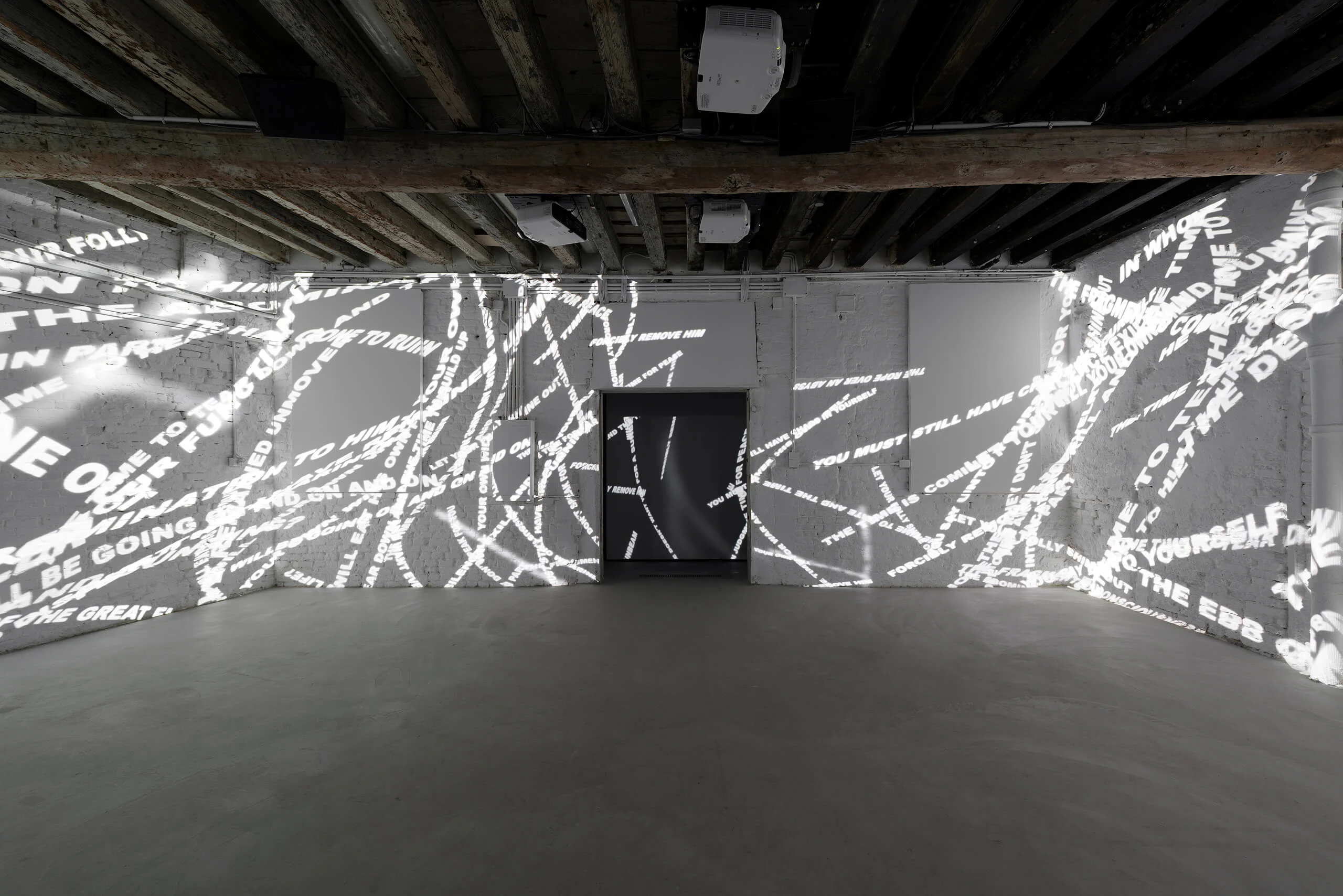 The pace at which new text appears increases as the sound or music intensifies to build tension. “The thief, the enemy, the wrath, the purge, the omen, the disasters, the righteous, the wicked, the darken sun, the bloody moon, the mighty wind, the falling stars.” The words start out readable so that the audience can grasp the content of the piece, but eventually become illegible when the feeling of the artwork becomes more important. The interpretation of the phrases is left up to the viewer to make sense of, or not.