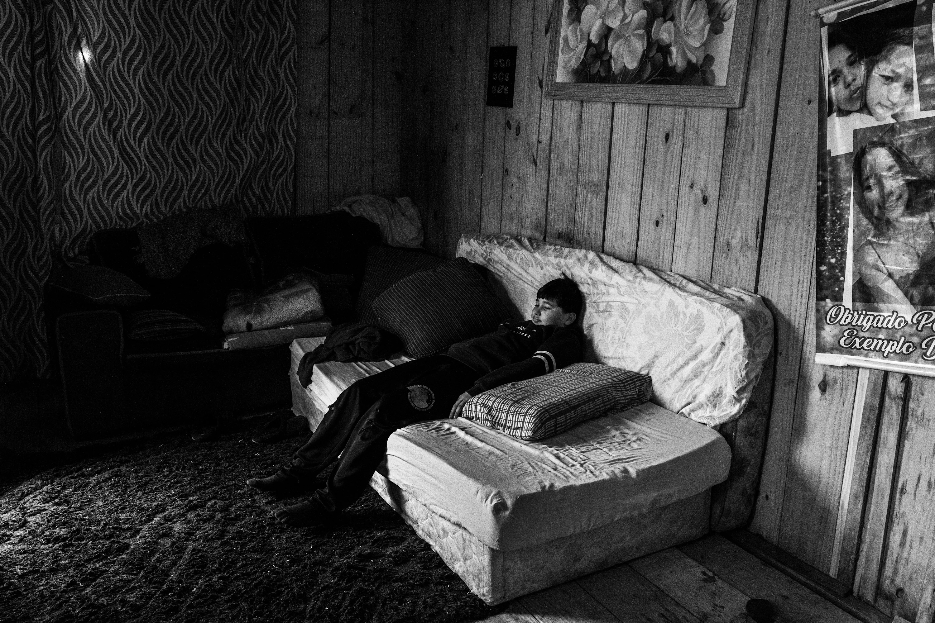 Through her series “A Territory of Hope,” Ribeiro bears witness to the complexity of life in a provisional territory. Every image becomes a portrait of resilience. We see Admilson, a metal worker, walking with his son Arthur along a dirt road. He has lived in the settlement for four years with his wife and two children. Behind him, a row of precarious makeshift homes fills the frame, some in desperate need of repair. In another image, Ryan—a 12-year-old boy who lives with his mother, Fabiana, and his sister, Tayla—watches TV on a makeshift sofa made from mattresses. The scene quietly illuminates the creative improvisation of residents who seek a sense of function and normality amongst the constant unknown.