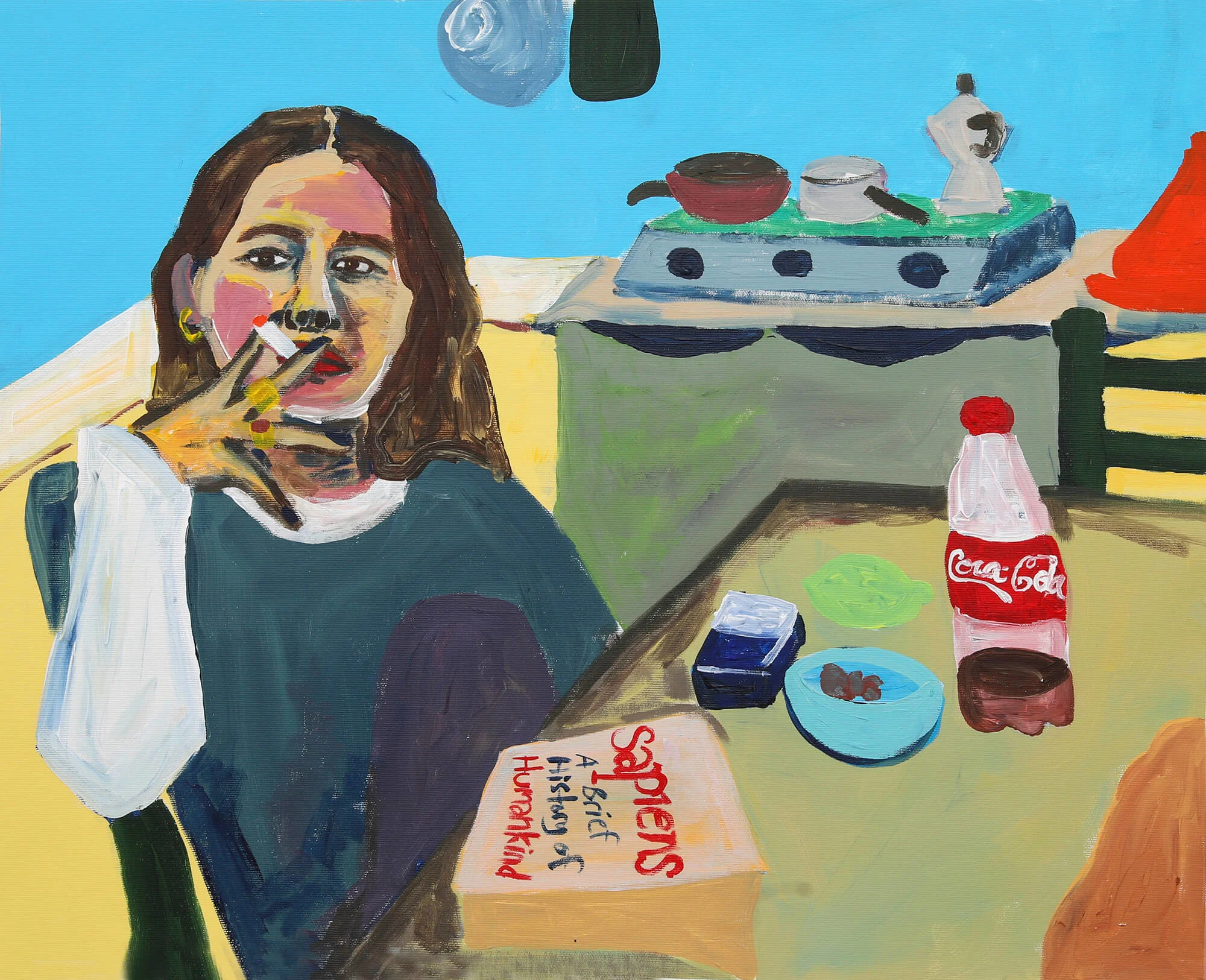 In one of my favorite paintings, a young woman sits at a table, an unopened copy of Yuval Noah Hariri’s Sapiens: A Brief History of Humankind in front of her. The woman is smoking a cigarette and appears to be mid-thought, she is beautiful and casually cool, but it’s the book that stands out to me. At face value I see: a woman in Tunis reading a best-selling book that is available for sale at most airports (this matters if you’re in a country where Amazon packages don’t arrive in two months, let alone two days). I also see the rest: Hariri is an atheist, and Israeli, in Tunis it’s the sort of book that would likely spark more of a conversation about the author himself than the content.