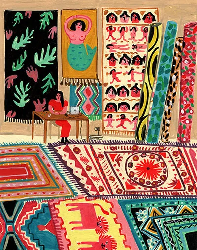 The detail in María’s works is astounding: in her drawing of an overflowing newsstand, the shelves are packed tight with her recreations of magazine covers. A drawing of a rug shop is layered with sophisticated pattern-clashing.