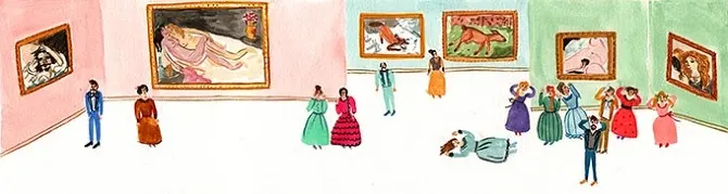 In one of her museum-inspired projects María painted a series of small watercolors set in art museums where things were going considerably pear-shaped. She imagined a calamity at a Marina Abramović retrospective and an accident at the opening of a Basquiat show. The detailed paintings are full of hidden stories, like “a woman in shock looking at The origin of the world during a Courbet exhibition, or a museum worker falling from a ladder while trying to hang a Matisse painting.”